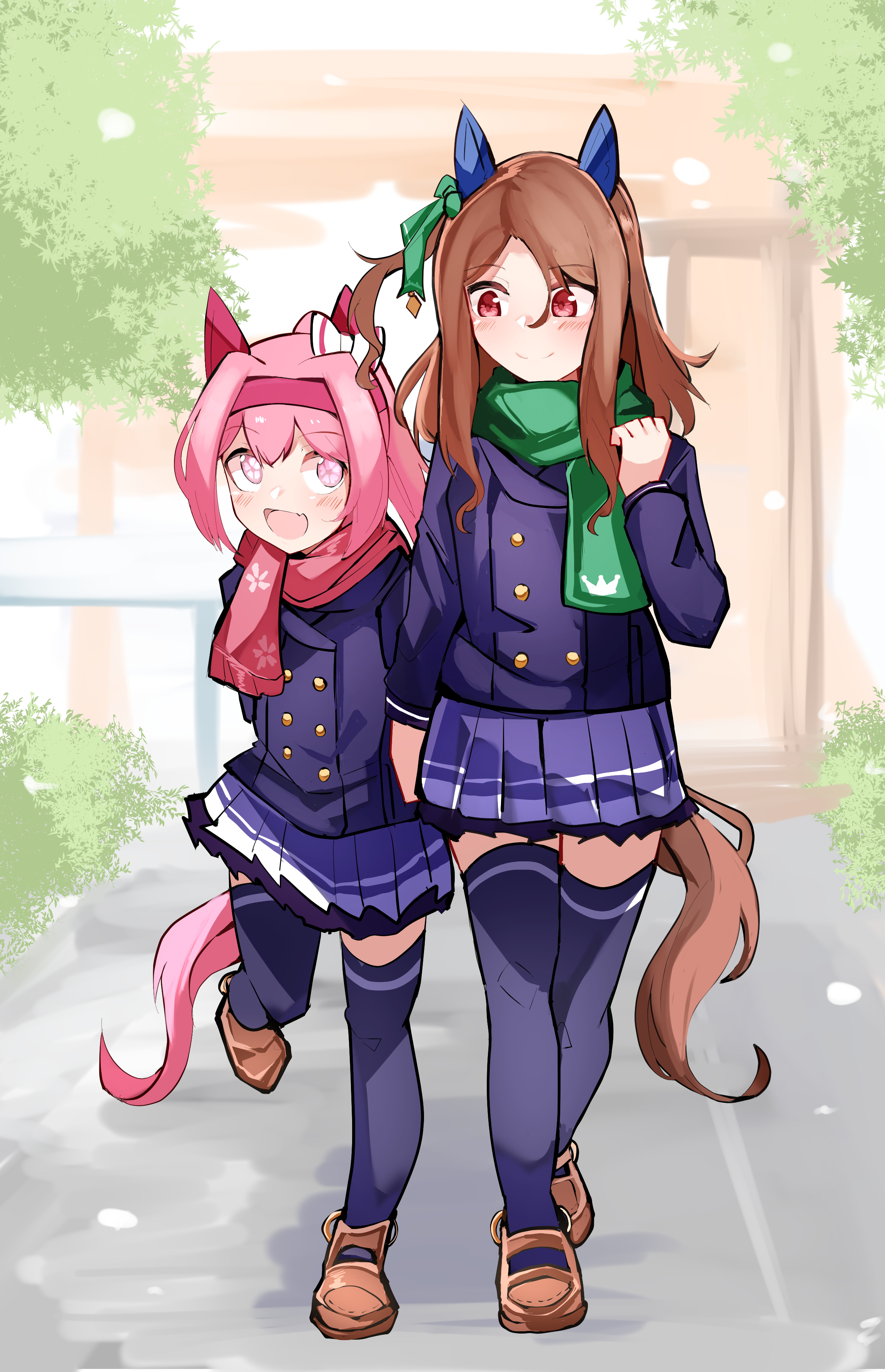 2girls :d absurdres animal_ears blush bow brown_hair brown_shoes closed_mouth commentary_request day ear_bow flower-shaped_pupils green_bow green_scarf hair_bow hand_up haru_urara_(umamusume) highres horse_ears horse_girl horse_tail jacket king_halo_(umamusume) multiple_girls one_side_up open_mouth outdoors pink_eyes pink_hair pleated_skirt purple_jacket purple_skirt purple_thighhighs red_eyes red_scarf scarf school_uniform shi_(kamokamo910) shoes skirt smile symbol-shaped_pupils tail thighhighs tracen_school_uniform umamusume walking white_bow