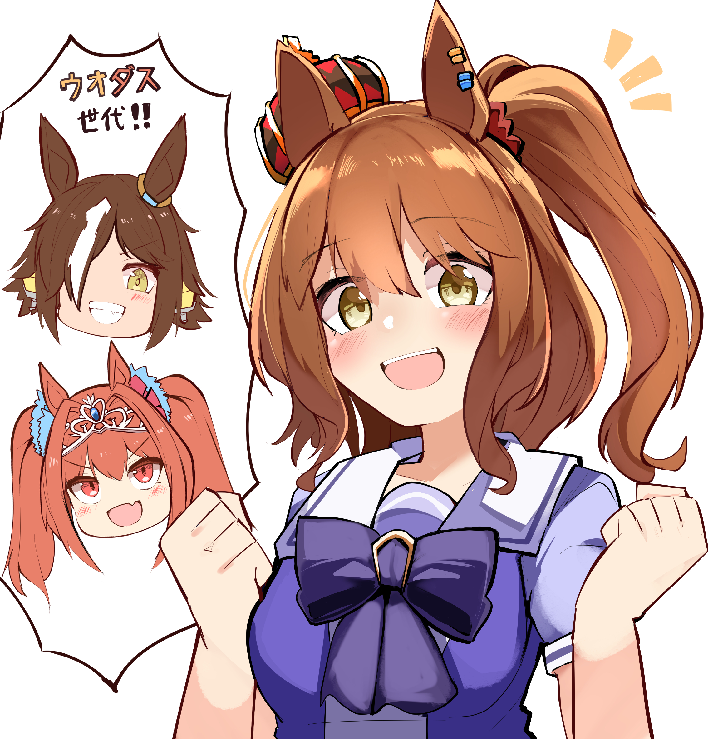 3girls :d animal_ears aston_machan_(umamusume) blush bow breasts brown_eyes brown_hair clenched_hands crown daiwa_scarlet_(umamusume) ear_piercing grin hair_between_eyes hair_intakes hands_up highres horse_ears long_hair medium_breasts mini_crown multicolored_hair multiple_girls notice_lines one_side_up open_mouth piercing puffy_short_sleeves puffy_sleeves purple_bow purple_shirt red_eyes school_uniform shi_(kamokamo910) shirt short_sleeves simple_background smile streaked_hair tiara tilted_headwear tracen_school_uniform translation_request twintails umamusume v-shaped_eyebrows vodka_(umamusume) white_background white_hair