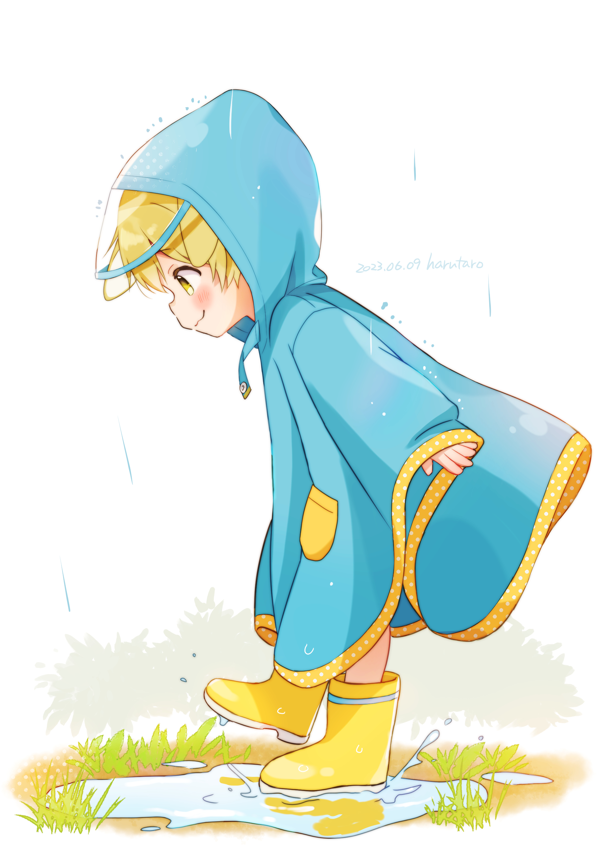 1boy absurdres animal_ears blonde_hair blush boots child closed_mouth far_tarooo grass highres hood hood_up hooded_coat male_focus noru_(far_tarooo) original outdoors outstretched_arm parted_bangs pocket puddle rabbit_boy rabbit_ears rain raincoat rubber_boots see-through_clothes see-through_headwear smile solo standing standing_on_one_leg visor_cap white_background yellow_boots yellow_eyes yellow_trim