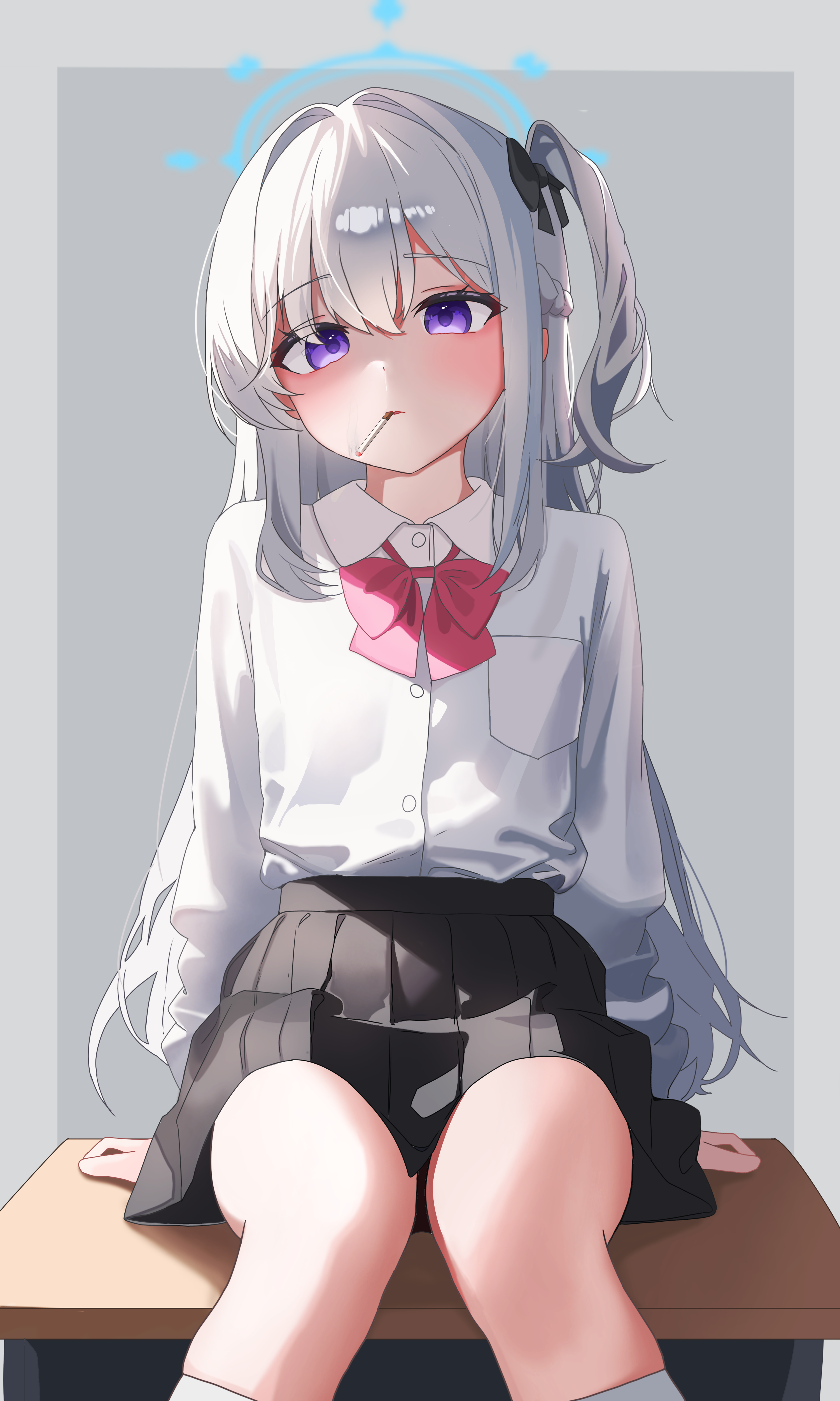 1girl absurdres black_skirt blue_archive blue_halo border breast_pocket cigarette collared_shirt commentary desk drawing_flover grey_background halo highres looking_at_viewer miyako_(blue_archive) on_desk pleated_skirt pocket purple_eyes red_ribbon ribbon shirt sitting skirt smoking solo white_border white_hair white_shirt