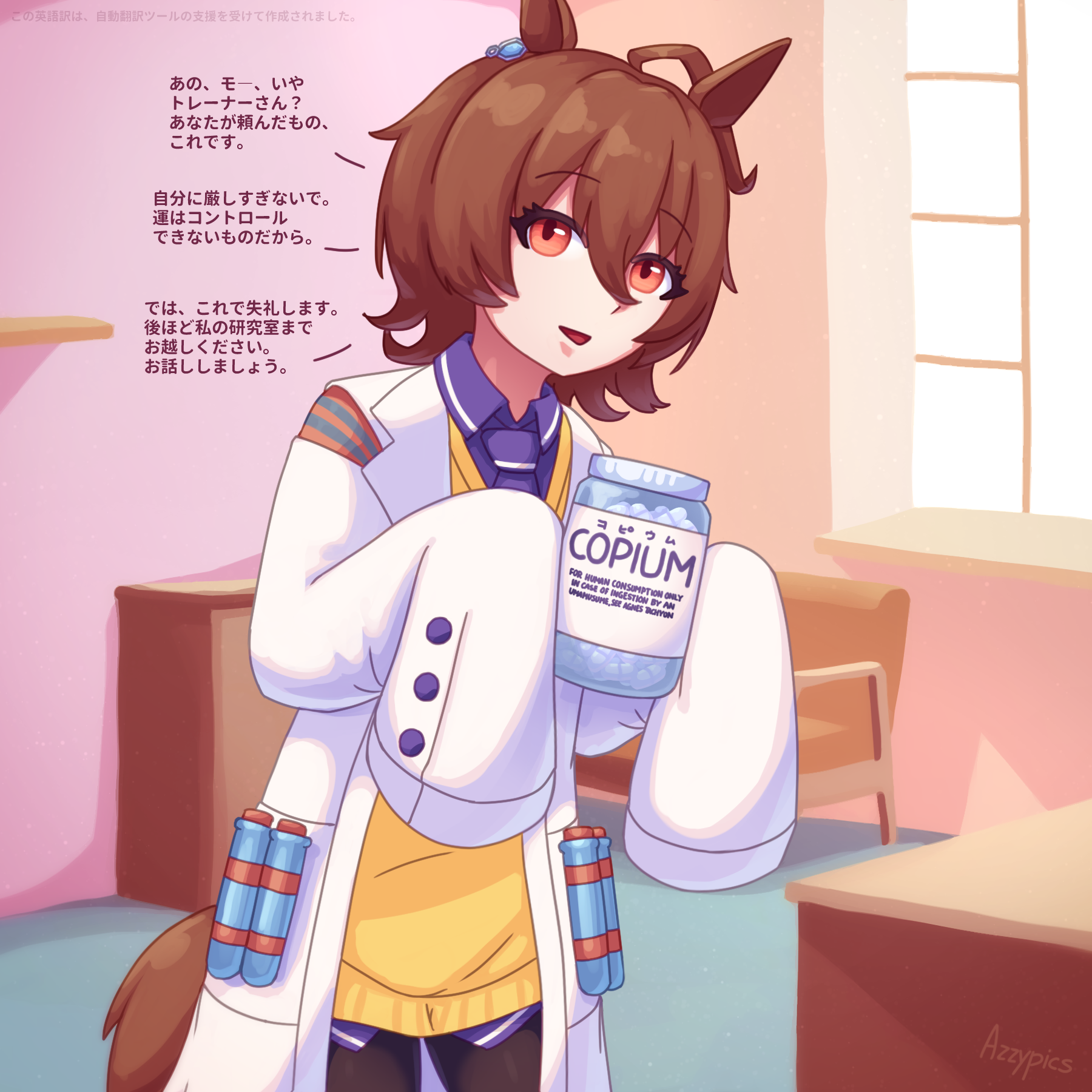 1girl agnes_tachyon_(tach-nology)_(umamusume) agnes_tachyon_(umamusume) animal_ears azzypics black_pantyhose brown_hair copium_(meme) hair_between_eyes highres holding holding_jar horse_ears horse_girl horse_tail jacket jar lab_coat meme necktie open_mouth pantyhose purple_necktie purple_shirt red_eyes shirt short_hair sleeves_past_fingers sleeves_past_wrists solo sweater tail translation_request umamusume white_jacket yellow_sweater