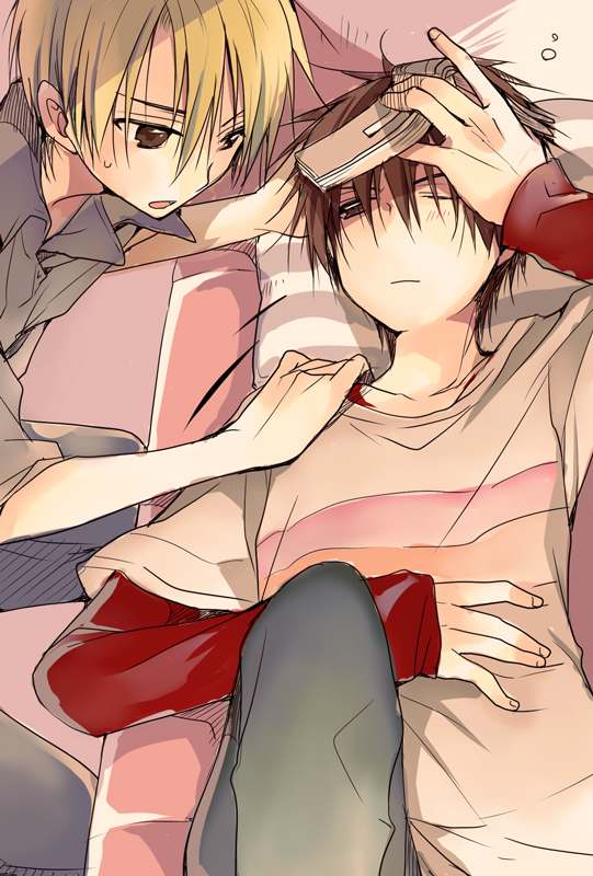 2boys blonde_hair book clip_studio_paint_(medium) ever_17 grey_shirt hibiki_mio hokuto_(ever_17) holding holding_book kaburaki_ryougo layered_sleeves long_sleeves multiple_boys open_book shirt short_hair short_over_long_sleeves short_sleeves striped_clothes striped_shirt