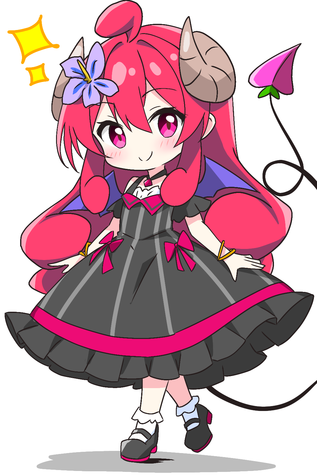 1girl alternate_eye_color alternate_hair_color black_choker black_dress black_shoes blush bow brown_horns choker closed_mouth commentary_request curled_horns demon_girl demon_tail dress dress_bow flower frilled_dress frills full_body hair_flower hair_ornament highres horns kotatsu-mazoku lilith_(homunculus)_(machikado_mazoku) lilith_(machikado_mazoku) long_hair looking_at_viewer machikado_mazoku mary_janes pink_bow purple_flower red_eyes red_hair shoes short_sleeves simple_background smile socks solo sparkle standing tail white_background white_socks