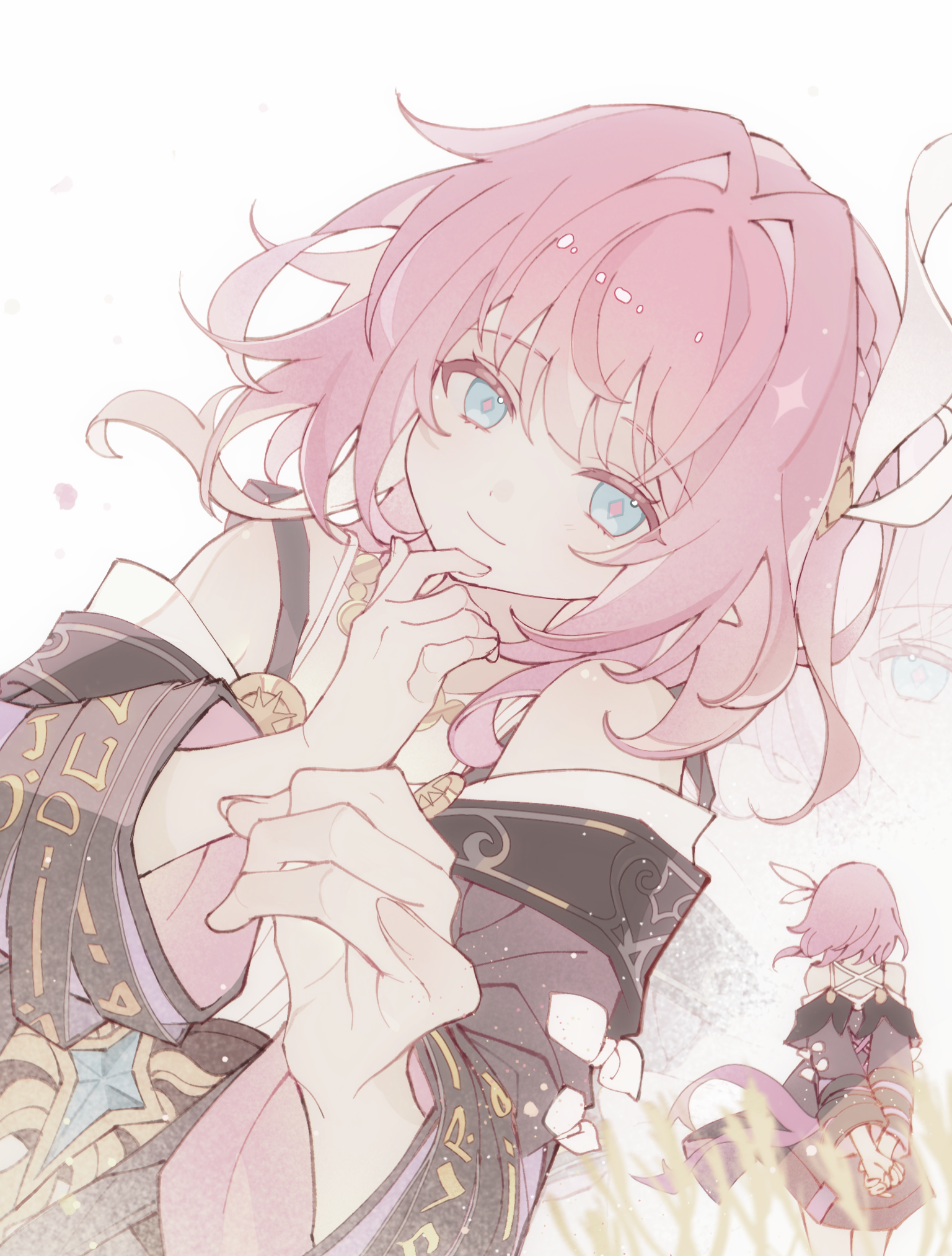 1girl bare_shoulders chinese_commentary coat commentary_request cyrene_(philia093)_(honkai:_star_rail) cyrene_(honkai:_star_rail) hair_ornament highres honkai:_star_rail honkai_(series) jewelry looking_at_viewer medium_hair multiple_views necklace pink_hair pointy_ears purple_coat simple_background smile wheat white_background yue_(shemika98425261)