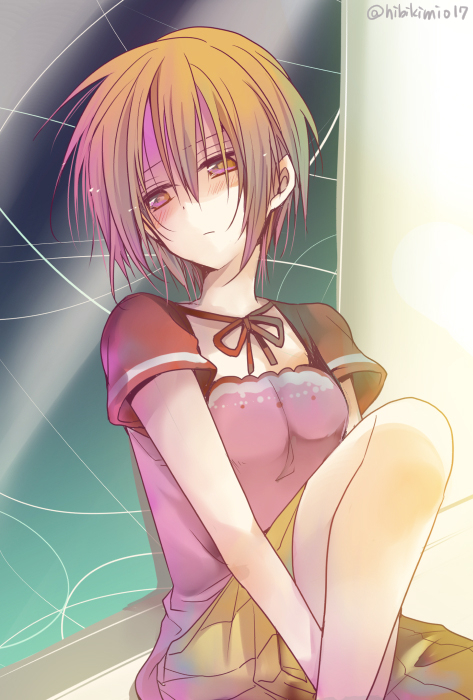 1girl ever_17 hibiki_mio orange_eyes orange_hair pink_shirt pleated_skirt sad shirt short_hair sitting skirt solo tanaka_yubiseiakikana