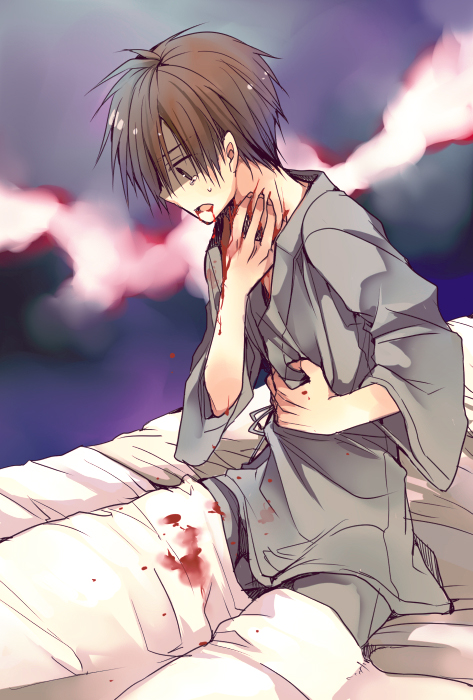 1boy bed blood blood_from_mouth blood_on_clothes brown_eyes brown_hair clip_studio_paint_(medium) ever_17 hibiki_mio hospital_gown kaburaki_ryougo male_focus short_hair sitting tears