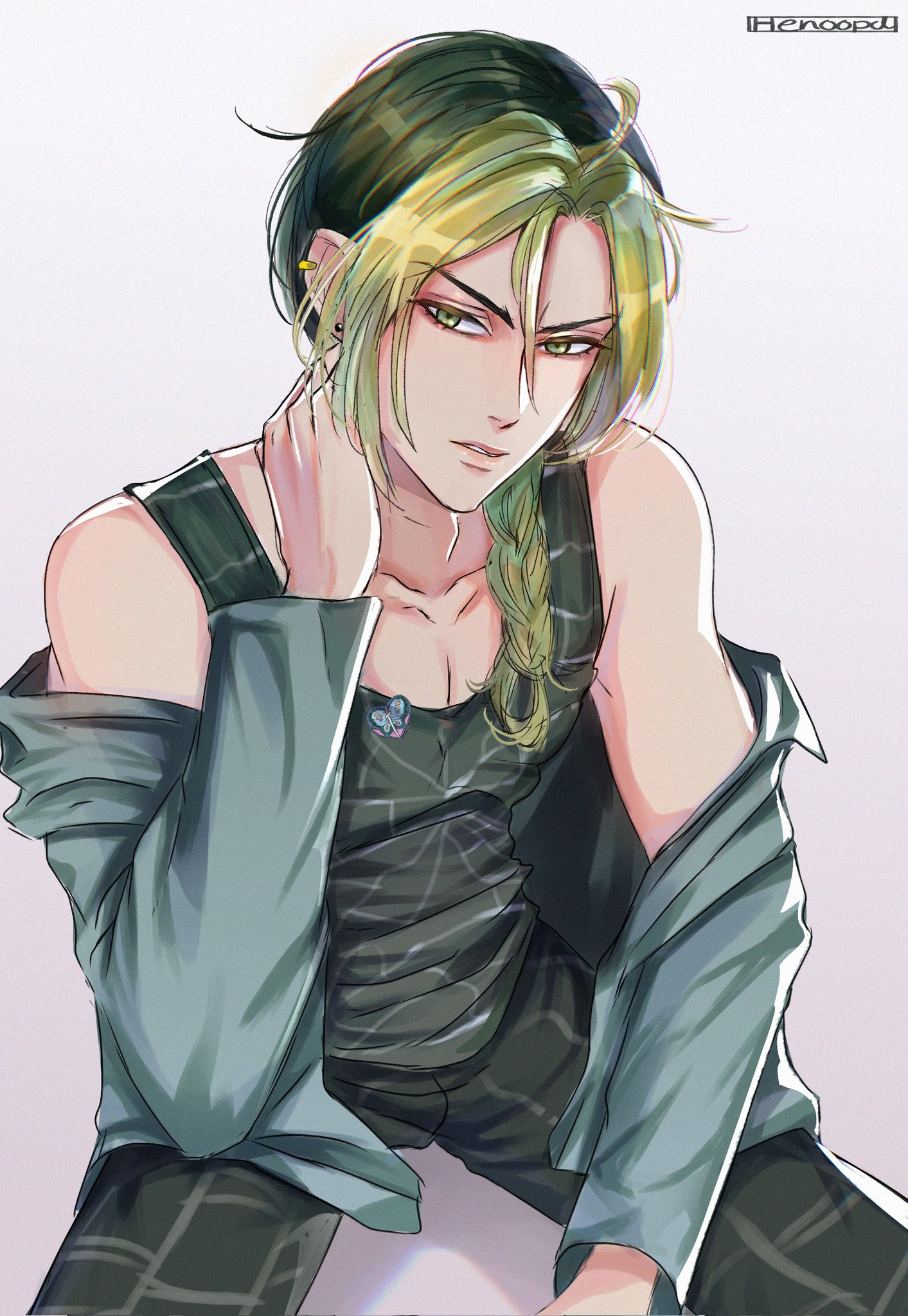 1boy alternate_hairstyle artist_name black_hair black_pants black_tank_top braid braided_ponytail clothes_lift collarbone commentary cowboy_shot ear_piercing earrings english_commentary genderswap genderswap_(ftm) gradient_background green_eyes green_hair green_jacket grey_background hair_between_eyes hand_on_own_neck hand_up henoopd highres jacket jacket_lift jewelry jojo_no_kimyou_na_bouken kuujou_jolyne long_hair looking_at_viewer male_focus multicolored_hair pants parted_lips pectoral_cleavage pectorals piercing sitting solo stone_ocean stud_earrings tank_top two-tone_hair