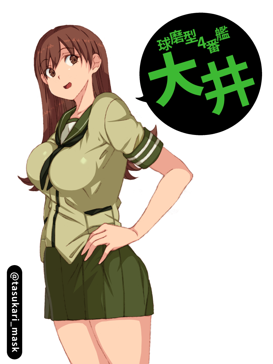 1girl black_neckerchief breasts brown_eyes brown_hair character_name cowboy_shot green_sailor_collar green_serafuku green_shirt green_skirt hand_on_own_hip highres kantai_collection large_breasts long_hair neckerchief one-hour_drawing_challenge ooi_(kancolle) pleated_skirt sailor_collar school_uniform serafuku shirt short_sleeves skirt solo tasukari_mask twitter_username