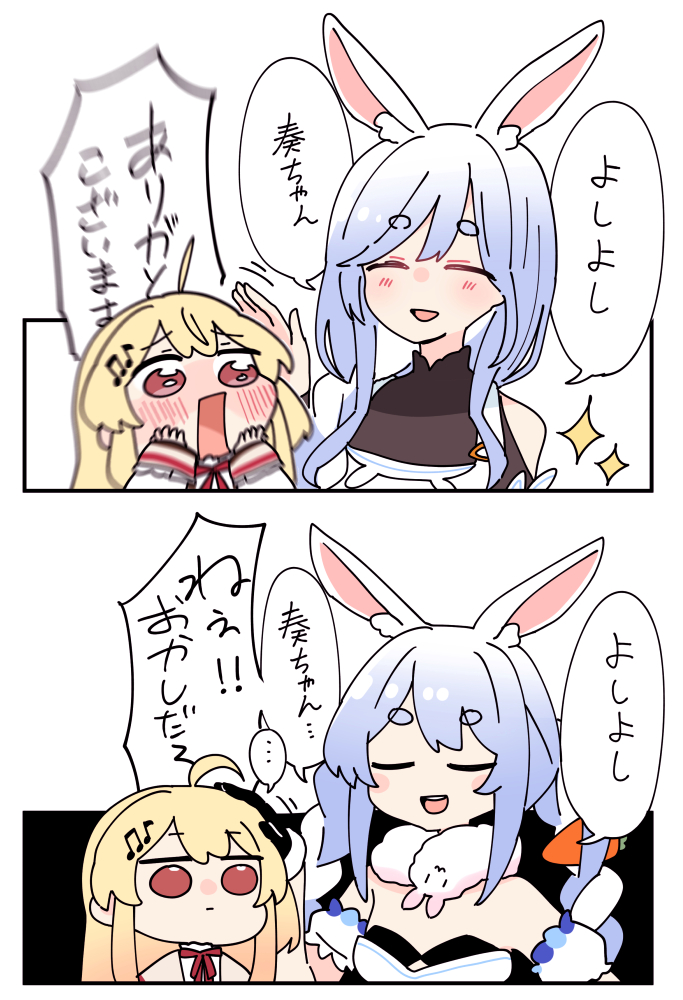 3girls animal_ears blue_hair braid carrot_hair_ornament closed_mouth don-chan_(usada_pekora) dress food-themed_hair_ornament fortissimo hair_ornament hololive hololive_dev_is mature_female mother_and_child mother_and_daughter multicolored_hair multiple_girls musical_note musical_note_hair_ornament otonose_kanade otonose_kanade_(1st_costume) parent_and_child pekomama rabbit_ears rabbit_girl red_eyes sakana_(saka11205) smile twin_braids two-tone_hair usada_pekora usada_pekora_(1st_costume) virtual_youtuber white_dress white_hair