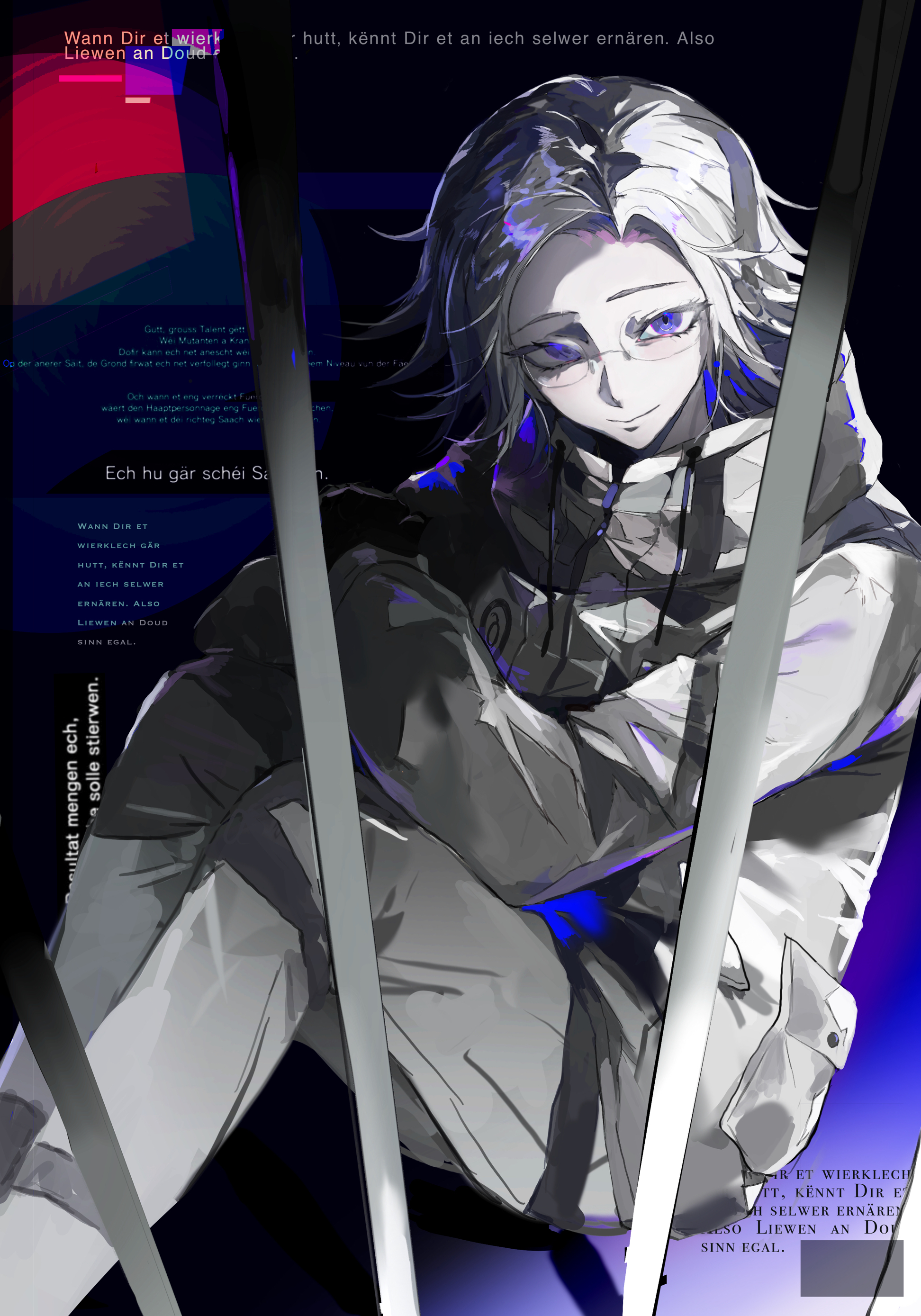 1boy absurdres aotsuki_eito black_gloves cage chinese_commentary glasses gloves grey_hair highres in_cage jacket knees_up kuma_(yoooooooo152) looking_at_viewer luxembourgish_text male_focus pocket purple_eyes short_hair sitting solo spoilers the_hundred_line_-last_defense_academy- white_jacket