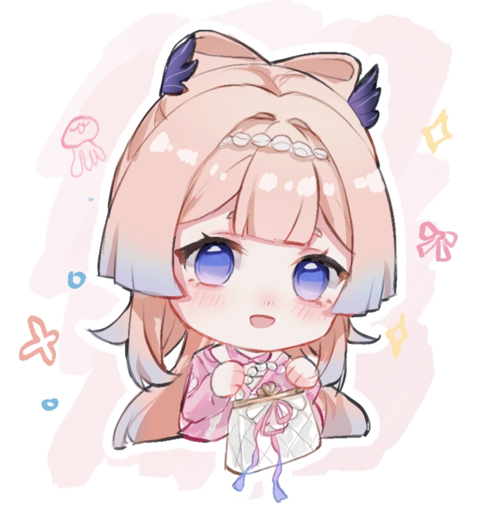 1girl bag blue_eyes blue_hair blunt_bangs border bow-shaped_hair chibi chinese_commentary colored_tips commentary_request cropped_torso eyelashes genshin_impact hair_ornament hairband handbag happy holding holding_bag light_blush long_sleeves looking_at_viewer meng_qiao multicolored_hair official_alternate_costume open_mouth outline pink_background pink_hair pink_shirt sangonomiya_kokomi sangonomiya_kokomi_(xiaohongshu) shirt smile solo sparkle two-tone_hair white_bag white_border white_hairband white_outline wing_hair_ornament
