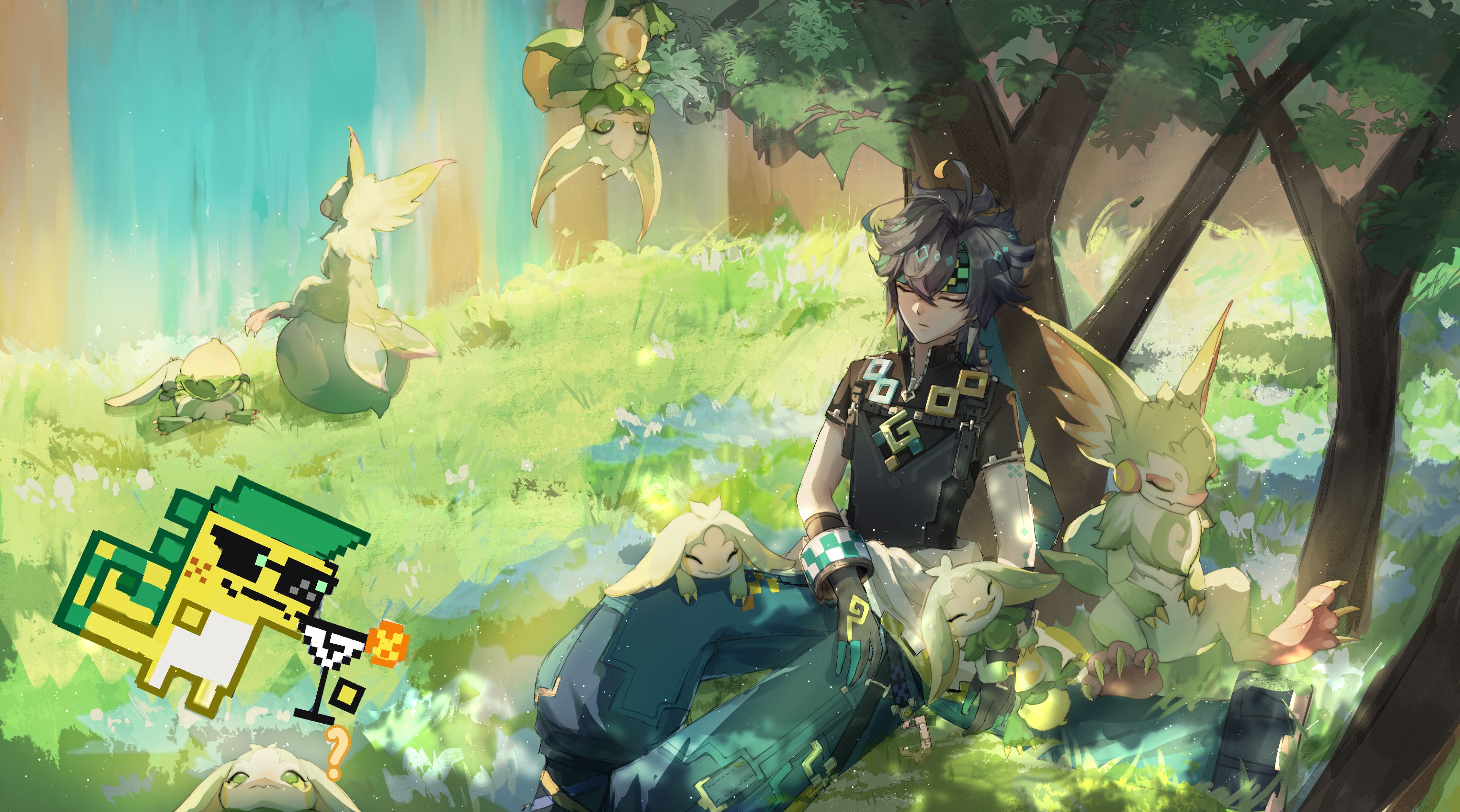 1boy ? absurdres against_tree ahoge ajaw_(genshin_impact) aqua_pants baggy_pants black_gloves black_hair black_shirt bracelet checkered_headband chinese_commentary cliff closed_eyes closed_mouth collared_shirt commentary_request crossed_bangs day feet_out_of_frame flower genshin_impact gloves grass green_headband hair_between_eyes headband high_collar highres jewelry kinich_(genshin_impact) light_frown light_particles male_focus meng_qiao outdoors pants shirt short_hair short_sleeves sleeping solo sunlight tree under_tree water waterfall white_flower yumkasaurus_(genshin_impact) zipper zipper_pull_tab