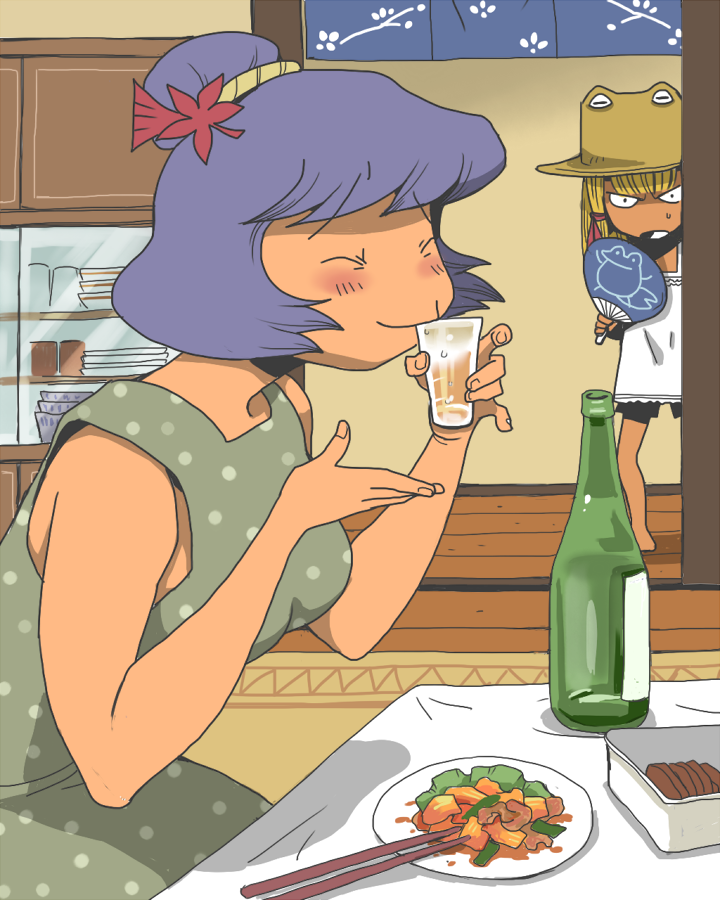 2girls alcohol alternate_costume bento blonde_hair blush bottle brown_hat chopsticks closed_eyes closed_mouth commentary_request dress drinking fanning_self frown full_body green_dress hair_bun hair_ornament hand_fan hat indoors leaf_hair_ornament looking_at_another moriya_suwako multiple_girls onikobe_rin open_mouth plate polka_dot polka_dot_dress purple_hair sake sake_bottle shaded_face short_hair shouwa single_hair_bun smile standing summer sundress touhou yasaka_kanako