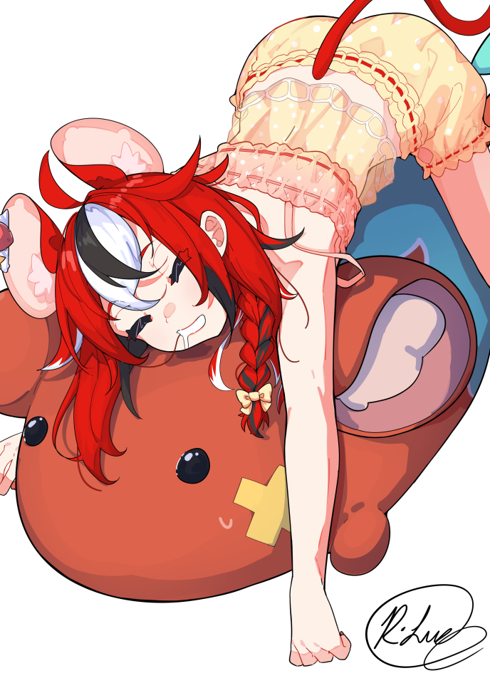 1girl ahoge animal_ears ass babydoll black_streaks braid closed_eyes double-parted_bangs hair_in_own_mouth hakos_baelz hakos_baelz_(strawberry_onesie) hololive hololive_english long_hair low_twin_braids lying mouse_ears mouse_girl mouse_tail mr._squeaks_(hakos_baelz) multicolored_hair on_stomach pink_babydoll polka_dot_babydoll puffy_shorts red_hair rlus saliva shorts signature simple_background sleeping sleepwear solo strap_slip streaked_hair stuffed_toy tail twin_braids virtual_youtuber white_background white_streaks yellow_babydoll yellow_shorts