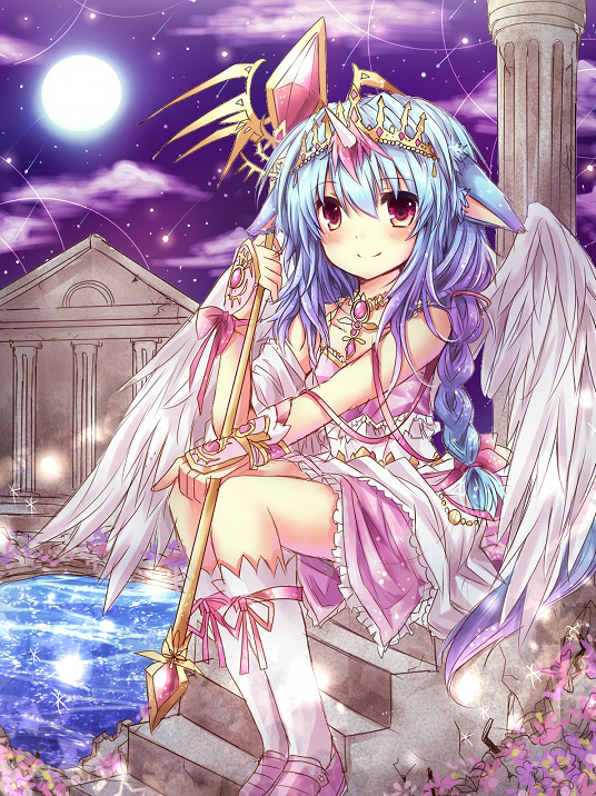 1girl animal_ears blue_hair blush braid building closed_mouth commentary_request dress feathered_wings flower gradient_hair holding holding_scepter horns kneehighs loafers looking_at_viewer multicolored_hair original pink_dress pink_shoes purple_hair purple_sky rudia scepter shoes single_braid single_horn sitting sitting_on_stairs sky smile socks solo split_mouth stairs tiara water white_socks white_wings wings