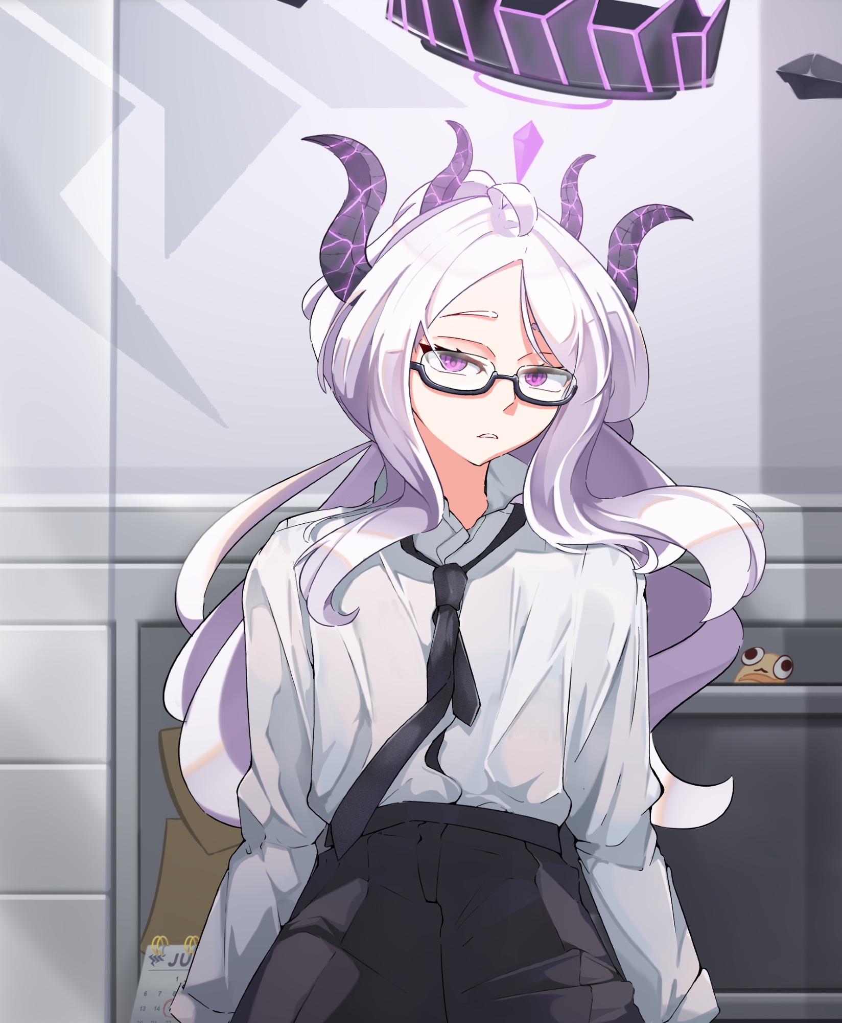 black_halo black_skirt blue_archive demon_horns gehenna_academy_logo glasses halo highres hina_(blue_archive) horns long_hair long_sleeves necktie office office_lady purple_eyes sincere_toast skirt white_hair