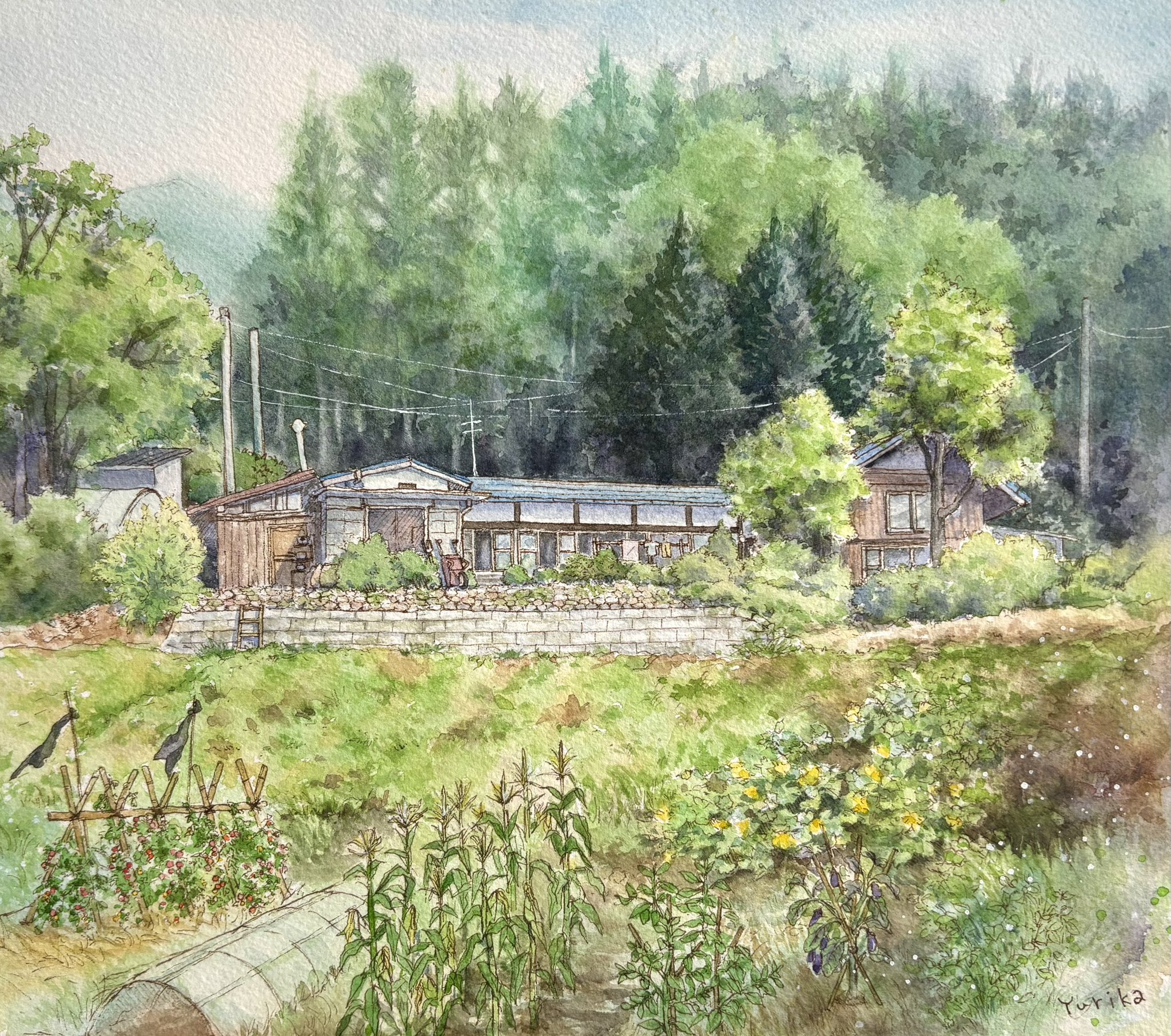 brick_wall building flower forest garden grass highres house nature no_humans ooy33151086 original painting_(medium) pine_tree plant power_lines rural scenery traditional_media tree utility_pole watercolor_(medium) yellow_flower