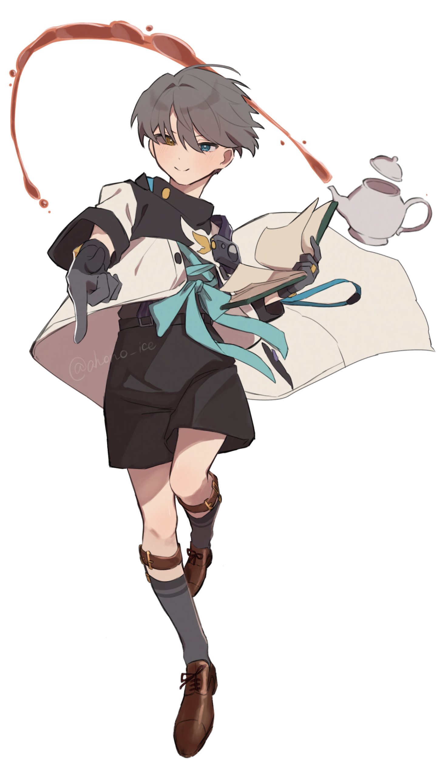 1boy absurdres aisu_(ahono_ice) black_sclera black_shorts blue_eyes book brown_shoes coat colored_sclera finger_gun full_body gloves grey_gloves grey_hair grey_socks hands_up heterochromia highres holding holding_book leg_up legwear_garter looking_at_viewer male_focus mismatched_sclera open_book outstretched_arm oxfords reverse:1999 shoes short_hair shorts smile socks solo spilling standing standing_on_one_leg tea teapot white_background white_coat x_(reverse:1999) yellow_eyes