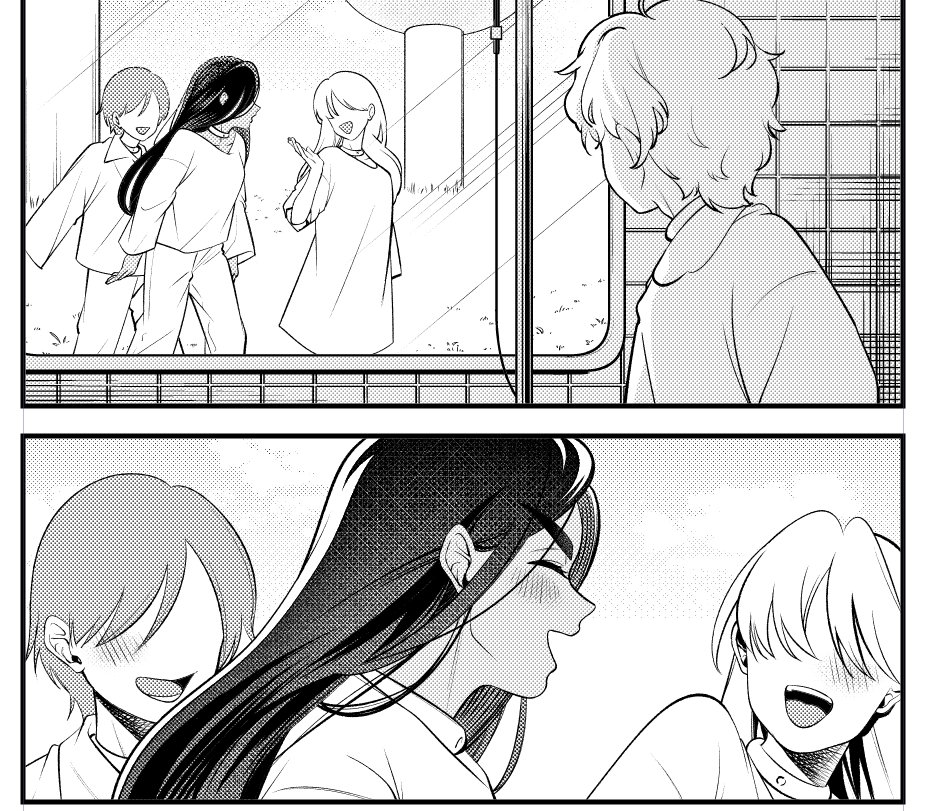 1boy 3girls alien_stage choker closed_eyes commentary_request dress greyscale hyuna_(alien_stage) long_hair long_sleeves looking_at_another luka_(alien_stage) monochrome multiple_girls ninoude_(yt7lkhimeo6t7lv) open_mouth pants shirt short_hair smile tile_wall tiles window