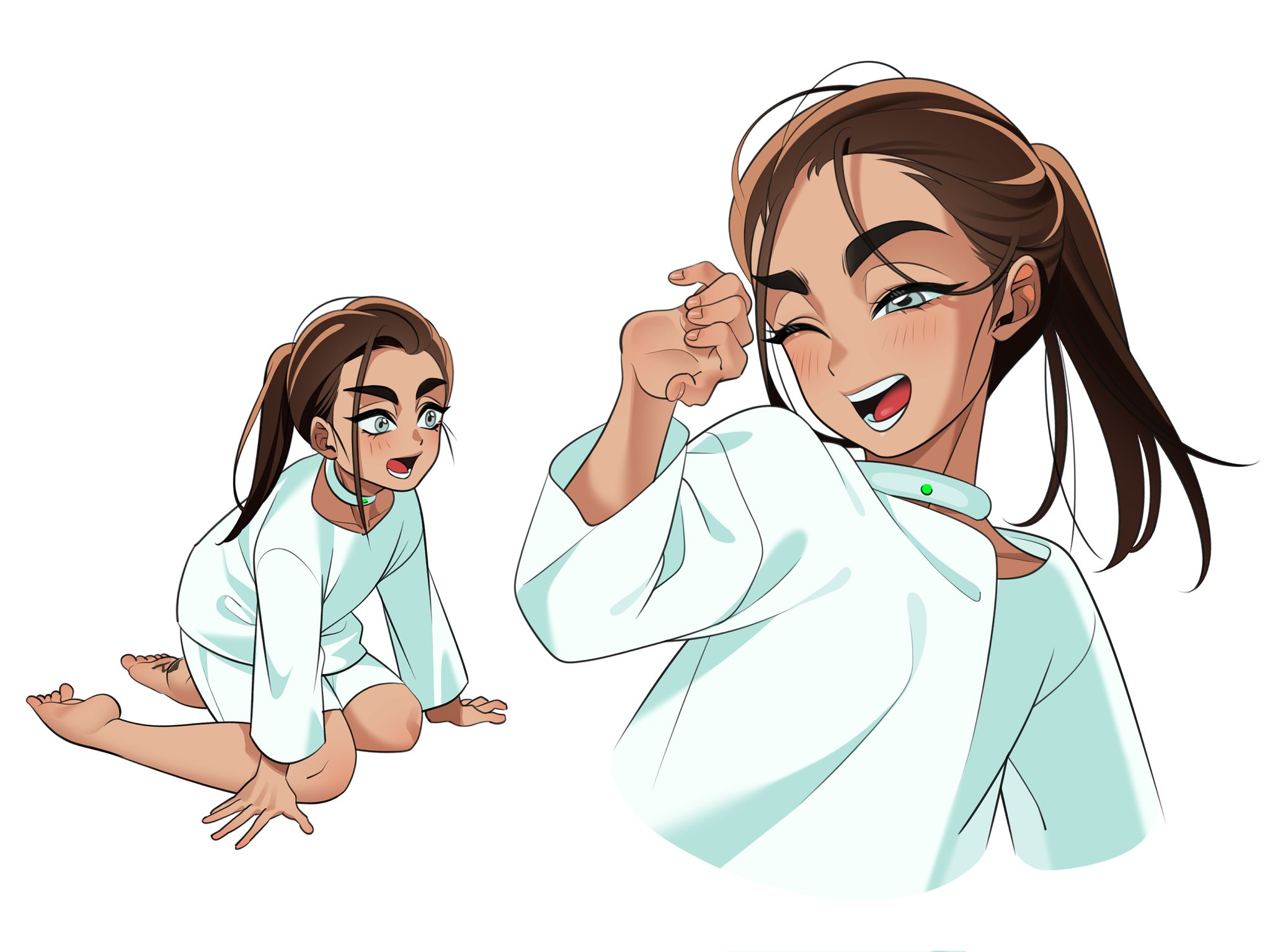 1girl aged_down alien_stage barefoot choker dark-skinned_female dark_skin grey_eyes highres hyuna_(alien_stage) long_hair long_sleeves multiple_views ninoude_(yt7lkhimeo6t7lv) one_eye_closed open_mouth ponytail shirt shorts sitting smile white_choker white_shirt white_shorts
