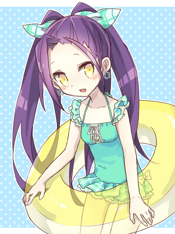 1girl ahoge bow earrings emil_chronicle_online forehead frilled_one-piece_swimsuit frills green_one-piece_swimsuit hair_bow huge_ahoge innertube jewelry long_hair mokuju_alma one-piece_swimsuit open_mouth purple_hair shinomaru_hajime split_ponytail swim_ring swimsuit yellow_eyes