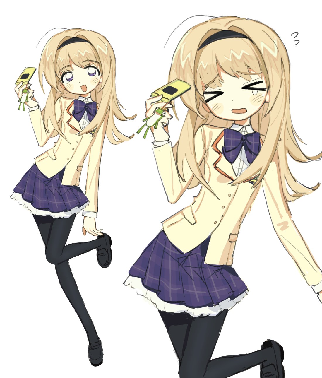 >_< 1girl ahoge black_hairband black_pantyhose blazer blonde_hair blush bow cellphone chaos;head flip_phone full_body hairband highres holding holding_phone jacket loafers long_hair mota_(motaberrie) multiple_views nishijou_nanami open_mouth pantyhose phone plaid_bow plaid_clothes plaid_skirt pleated_skirt purple_eyes school_uniform science_adventure shoes skinny skirt suimei_school_uniform white_background