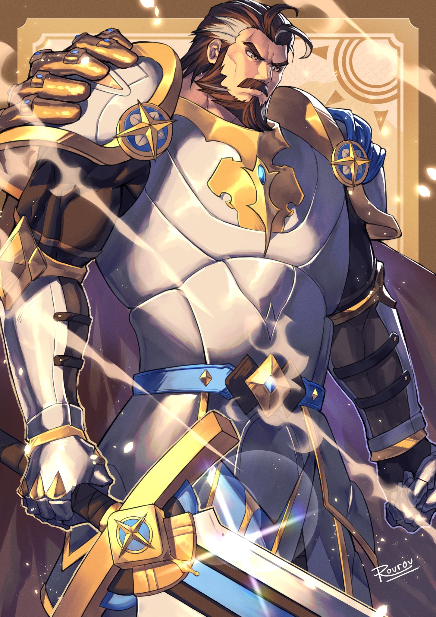 1boy afk_(series) afk_journey armor artist_name bara beard black_hair closed_mouth commentary diffraction_spikes english_commentary facial_hair grey_hair highres hogan_(afk) holding holding_sword holding_weapon looking_to_the_side male_focus multicolored_hair rovrov signature streaked_hair sword weapon