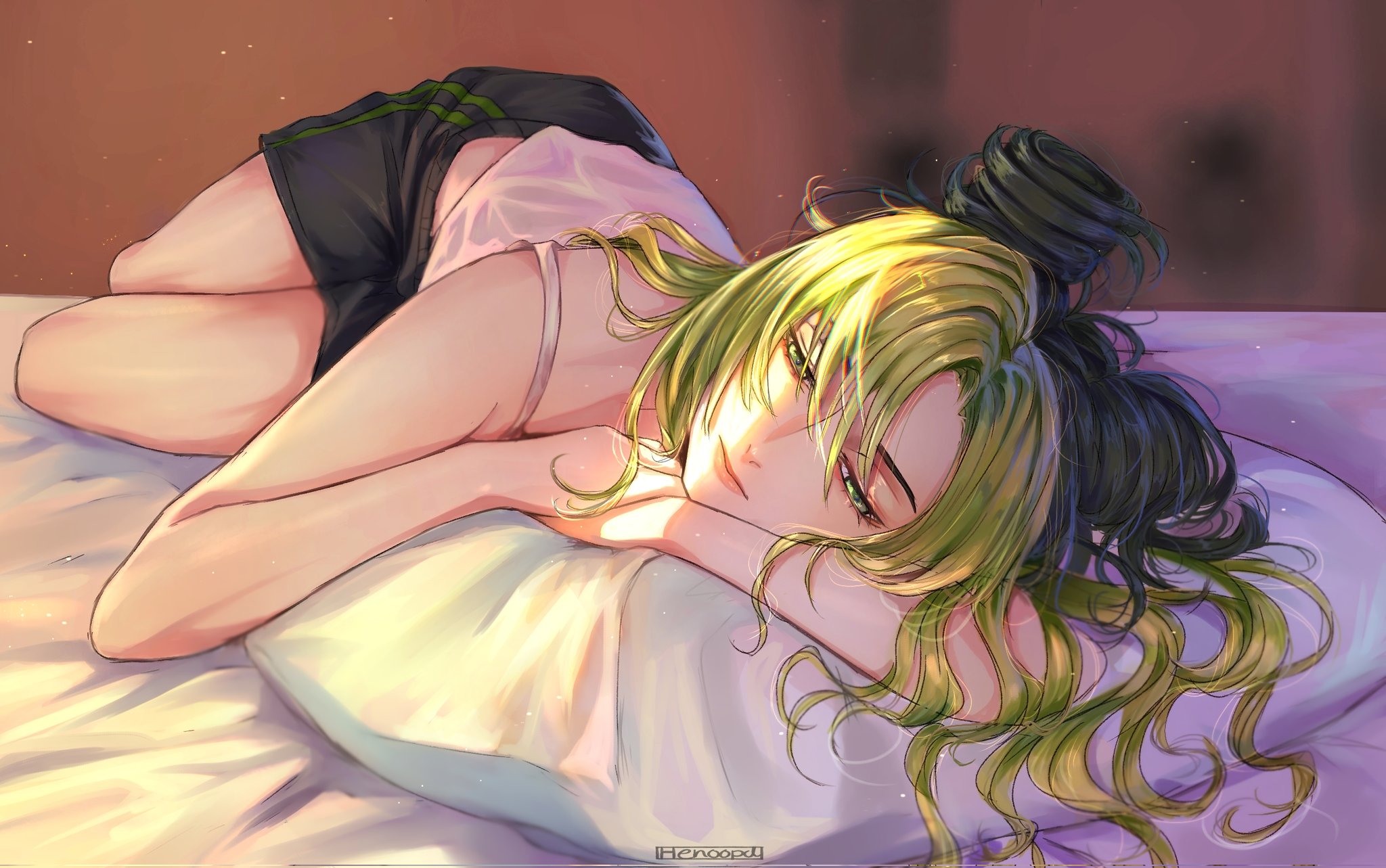 1girl artist_name bare_shoulders black_hair black_shorts blurry blurry_background camisole closed_mouth commentary double_bun english_commentary full_body green_eyes green_hair hair_between_eyes hair_bun half-closed_eyes hashtag-only_commentary henoopd highres indoors jojo_no_kimyou_na_bouken kuujou_jolyne light_particles lips long_hair looking_to_the_side lying multicolored_hair on_bed on_pillow on_side shorts sidelocks solo stone_ocean sunlight two-tone_hair white_camisole