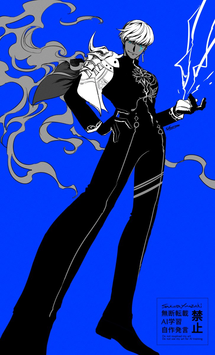 1boy armor black_gloves black_pants black_shirt black_shoes blue_background blue_eyes colored_sclera colored_skin dutch_angle earrings facial_mark fate/grand_order fate_(series) gloves grey_sclera grey_skin hand_on_own_hip highres indra_(fate) jewelry lightning lightning_bolt_facial_mark lightning_bolt_symbol male_focus monochrome pants partially_colored pauldrons shirt shoes short_hair shoulder_armor simple_background single_pauldron smoke solo standing white_hair yuuzuki230