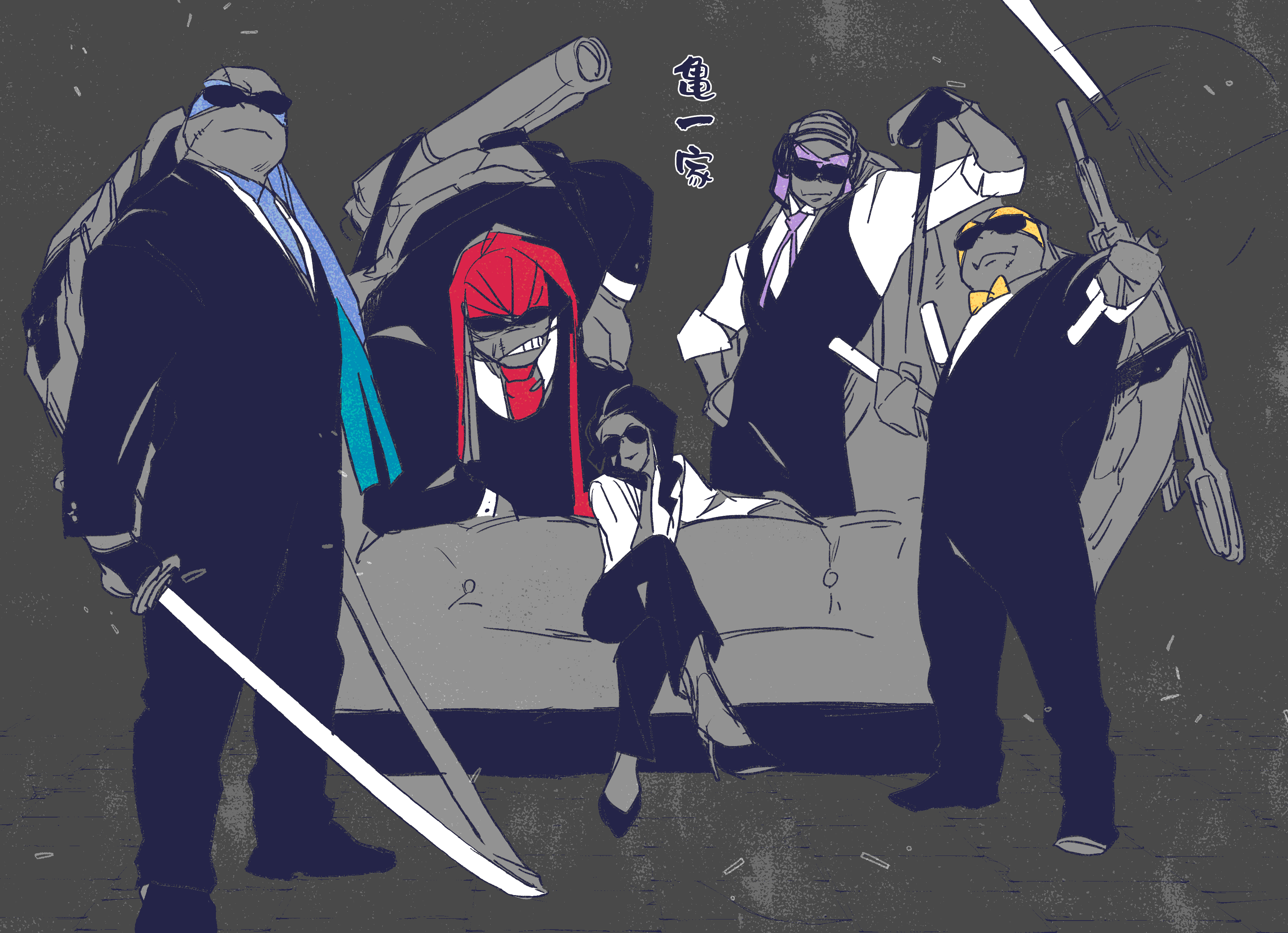 1girl 4boys absurdres april_o'neil bakushi_(smys2017) black_background commentary_request couch crossed_legs donatello_(tmnt) formal_clothes furry furry_male gun highres holding holding_sword holding_weapon katana leonardo_(tmnt) male_focus michelangelo_(tmnt) multiple_boys raphael_(tmnt) shell suit sunglasses sword teenage_mutant_ninja_turtles teenage_mutant_ninja_turtles_(2014) translation_request turtle_boy turtle_shell weapon