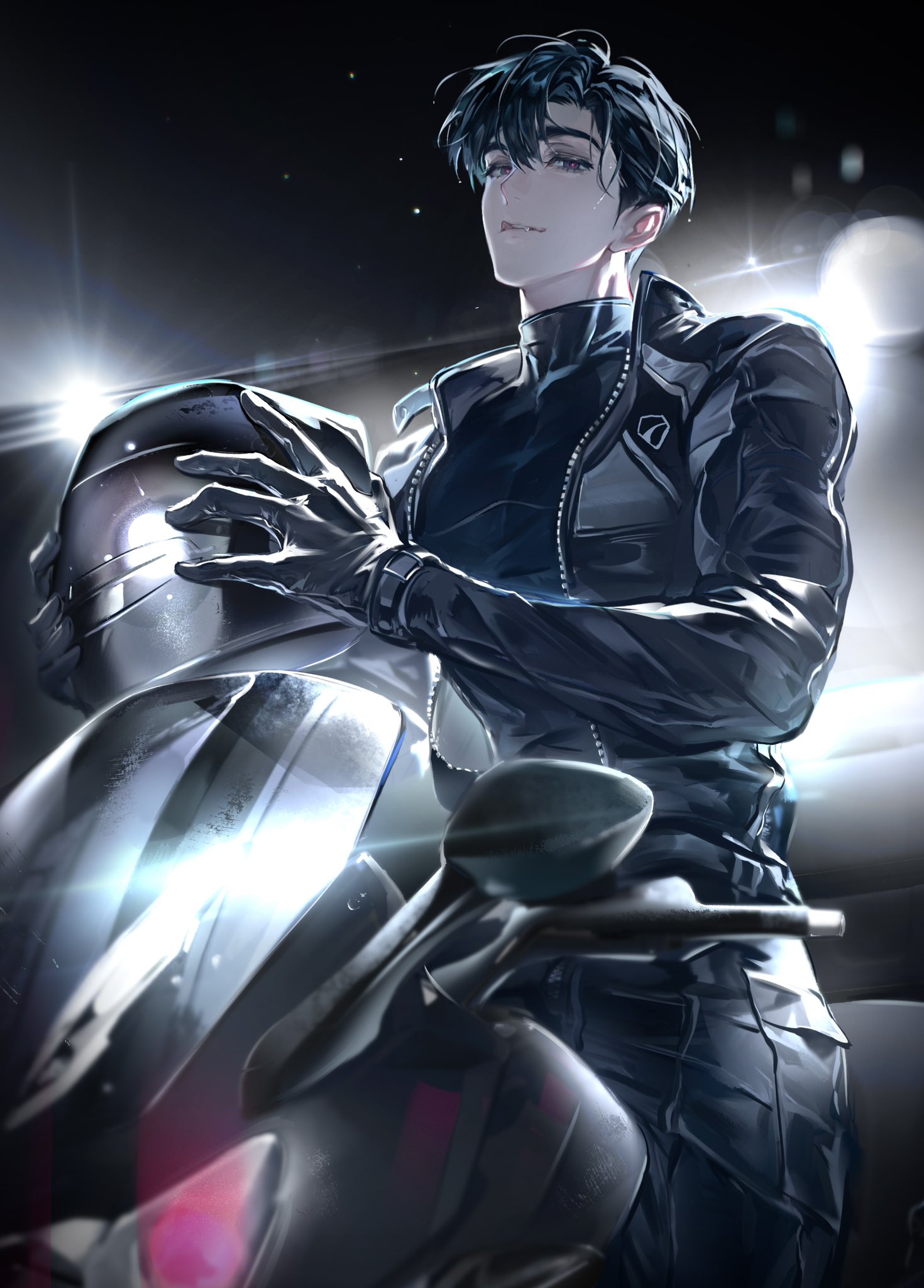 1boy alien_stage black_eyes black_gloves black_hair black_jacket black_shirt commentary deadprince gloves helmet highres holding holding_unworn_helmet ivan_(alien_stage) jacket lens_flare male_focus motor_vehicle motorcycle motorcycle_helmet on_motorcycle red_pupils shirt short_hair solo untranslatable_commentary tongue tongue_out turtleneck turtleneck_shirt unworn_helmet very_short_hair zipper