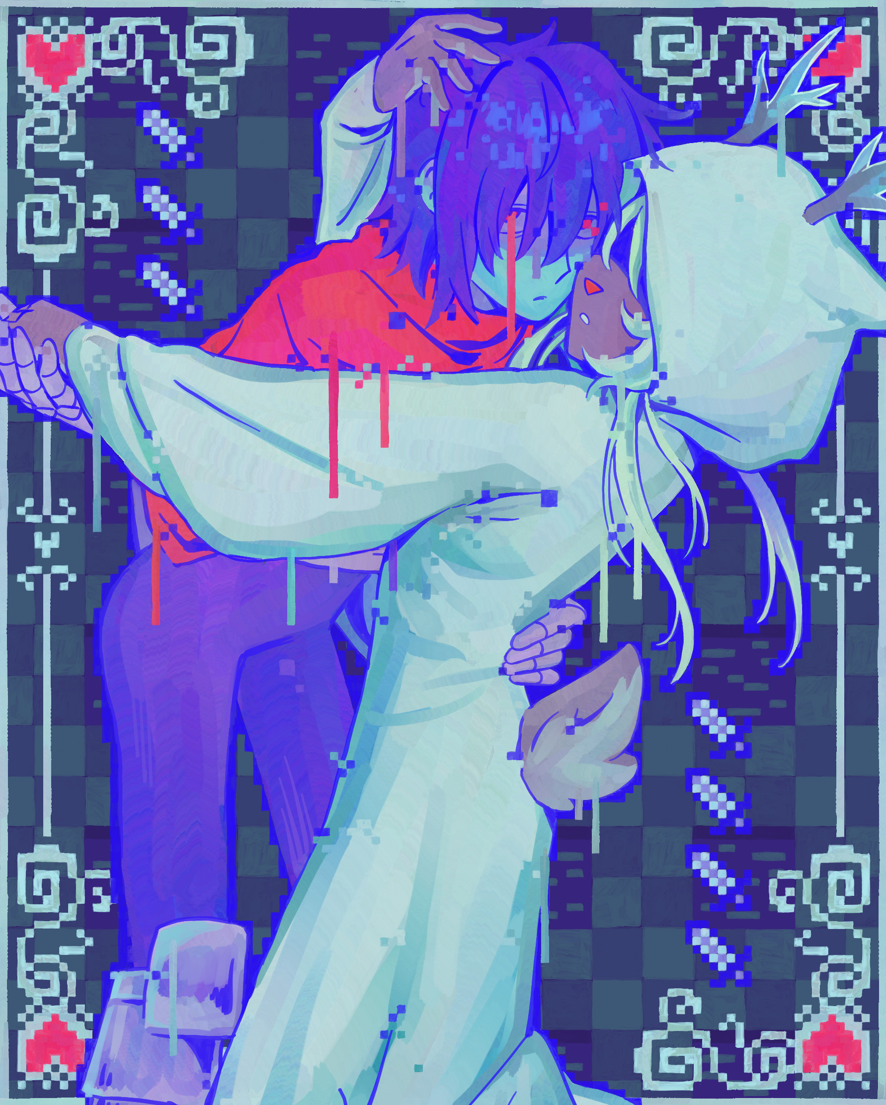 &{ID:12302594 CreatedAt:Fri Jul 18 18:00:24 -0500 2025 Score:2 Width:1783 Height:2224 MD5:7655d4487fe0098cd7b8aa5adaaf4531 Directory:76/55 Image:7655d4487fe0098cd7b8aa5adaaf4531.jpg Rating:general Source:https://goomyloid.tumblr.com/post/789427359400050688 Change:1755083644 Owner:danbooru CreatorID:6498 ParentID:0 Sample:1 PreviewHeight:350 PreviewWidth:280 Tags:1girl 1other antlers blue_hair blue_skin cape checkered_background colored_skin commentary covered_eyes deer_antlers deer_girl deer_tail deltarune english_commentary goomyloid hand_on_another's_back heart highres hood hood_up hooded_robe horns kris_(dark_world)_(deltarune) kris_(deltarune) looking_at_viewer noelle_holiday noelle_holiday_(dark_world) pixel_art pixel_heart red_cape red_eyes robe short_hair tail utdr_(toby_fox) white_robe Title: HasNotes:false HasComments:false FileURL:https://img2.gelbooru.com/images/76/55/7655d4487fe0098cd7b8aa5adaaf4531.jpg PreviewURL:https://gelbooru.com/thumbnails/76/55/thumbnail_7655d4487fe0098cd7b8aa5adaaf4531.jpg SampleURL:https://img2.gelbooru.com/samples/76/55/sample_7655d4487fe0098cd7b8aa5adaaf4531.jpg SampleHeight:1060 SampleWidth:850 Status:active PostLocked:0 HasChildren:false IsVideo:false DisplayDate:18.07.2025 18:00}