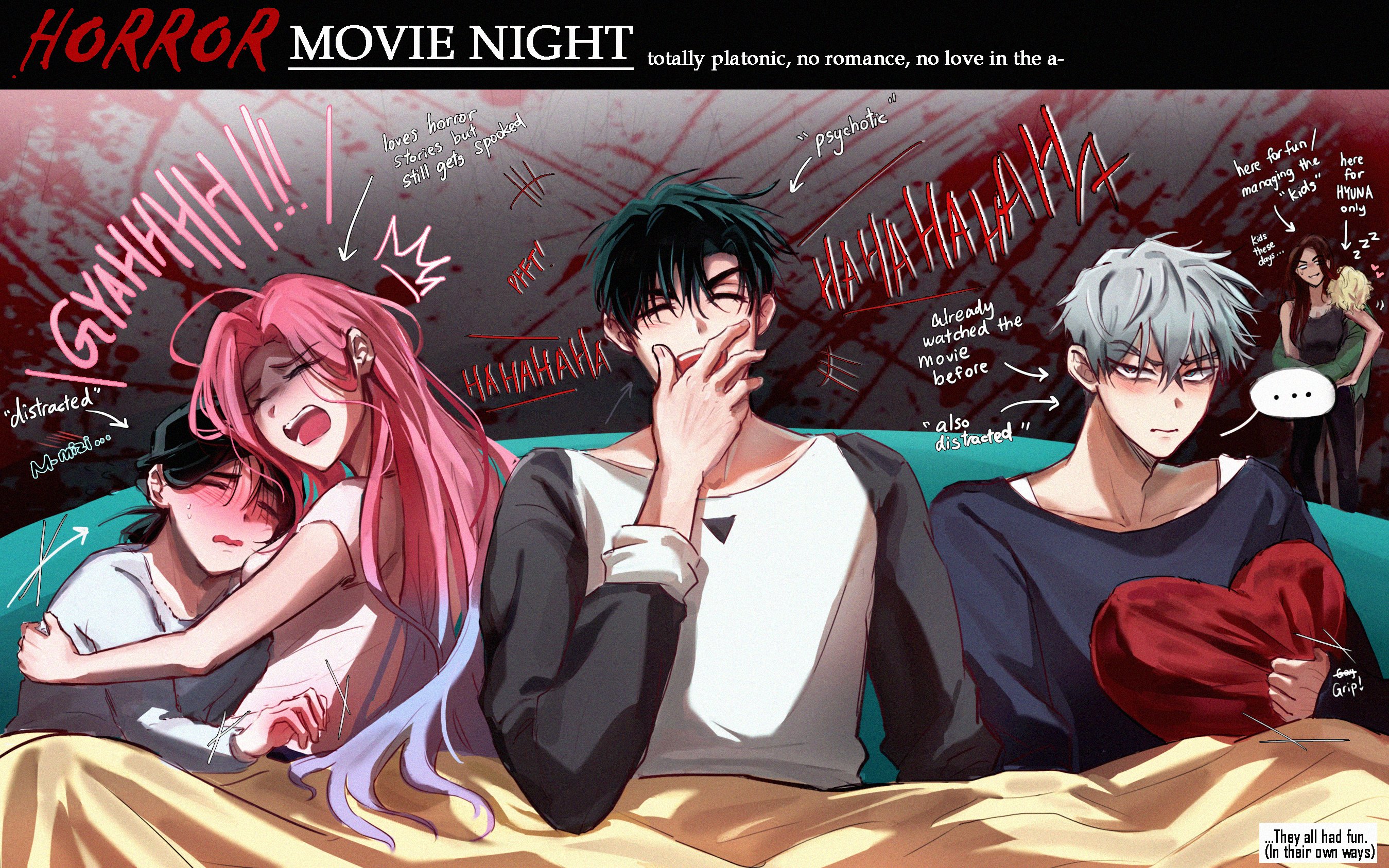 ... 3boys 3girls alien_stage black_hair black_shirt black_tank_top blanket blonde_hair blue_hair brown_hair closed_eyes commentary couch english_commentary english_text eve_hw green_eyes grey_hair heart heart-shaped_pillow highres hug hyuna_(alien_stage) ivan_(alien_stage) laughing long_hair luka_(alien_stage) mizi_(alien_stage) multiple_boys multiple_girls on_couch pillow pink_hair red_pupils screaming shirt short_hair sitting spoken_ellipsis sua_(alien_stage) tank_top till_(alien_stage) very_short_hair watching_television white_shirt