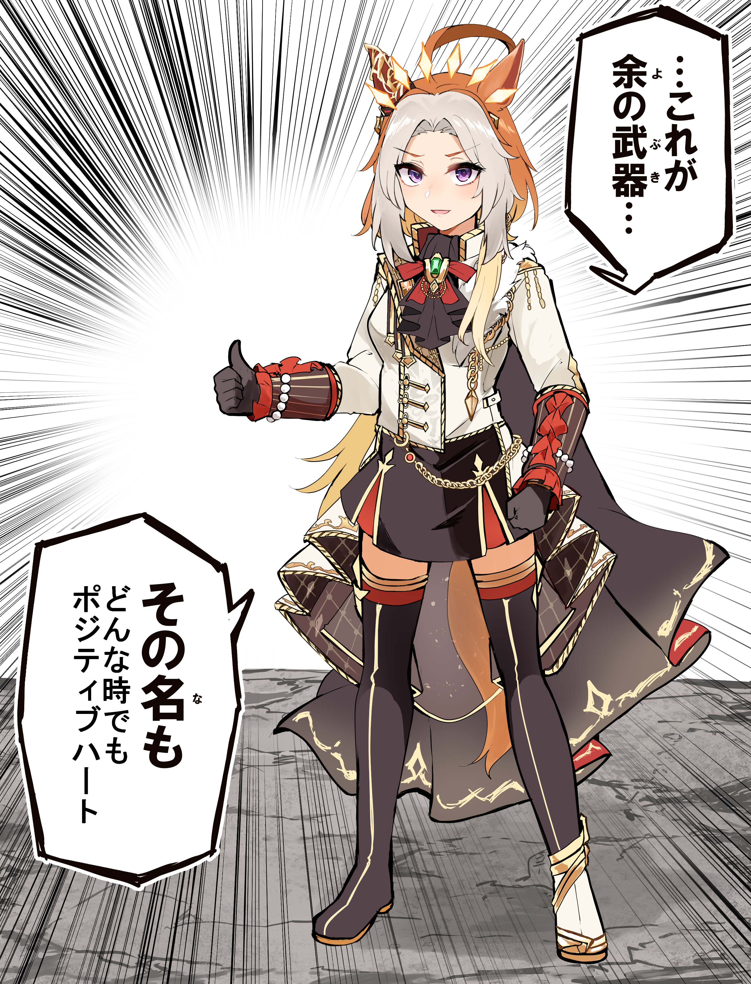 1girl absurdres ahoge animal_ears black_boots black_gloves black_shirt black_skirt black_thighhighs boots bow brown_hair collared_shirt commentary_request emphasis_lines forehead gloves grey_hair highres horse_ears horse_girl horse_tail jacket long_hair looking_at_viewer multicolored_hair orfevre_(umamusume) parted_bangs purple_eyes red_bow shi_(kamokamo910) shirt single_thigh_boot single_thighhigh skirt smile solo standing tail thigh_boots thighhighs thumbs_up translation_request two-tone_hair umamusume v-shaped_eyebrows white_background white_boots white_jacket