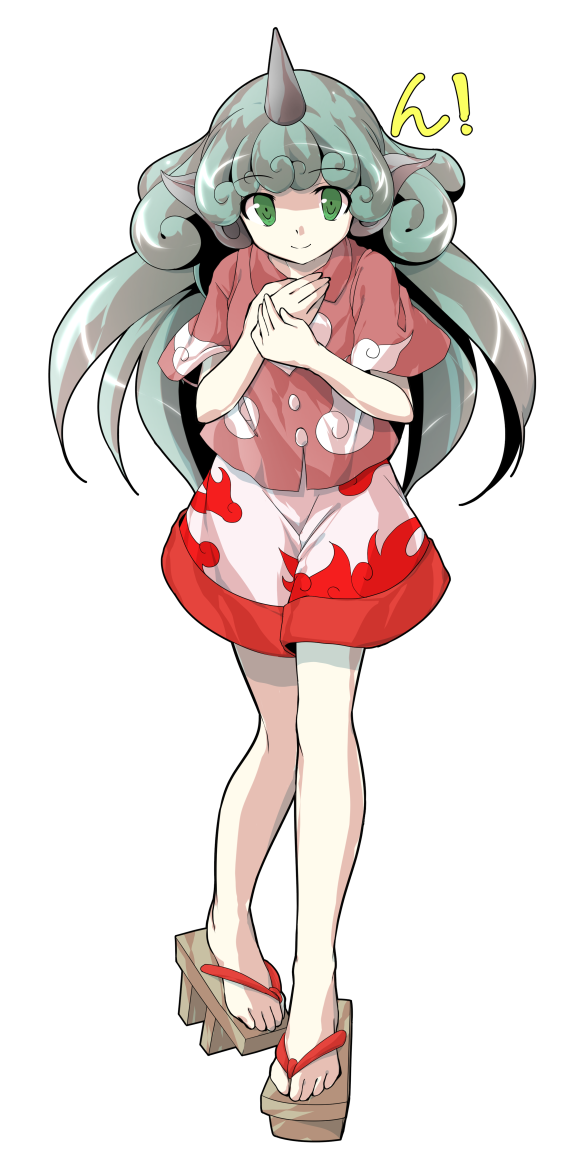1girl alphes_(style) closed_mouth collared_shirt commentary_request dairi full_body green_eyes green_hair horns kariyushi_shirt komainu_girl komano_aunn large_variant_set long_hair looking_at_viewer parody red_shirt shirt short_sleeves shorts single_horn smile solo standing style_parody tachi-e toes touhou transparent_background variant_set white_shorts