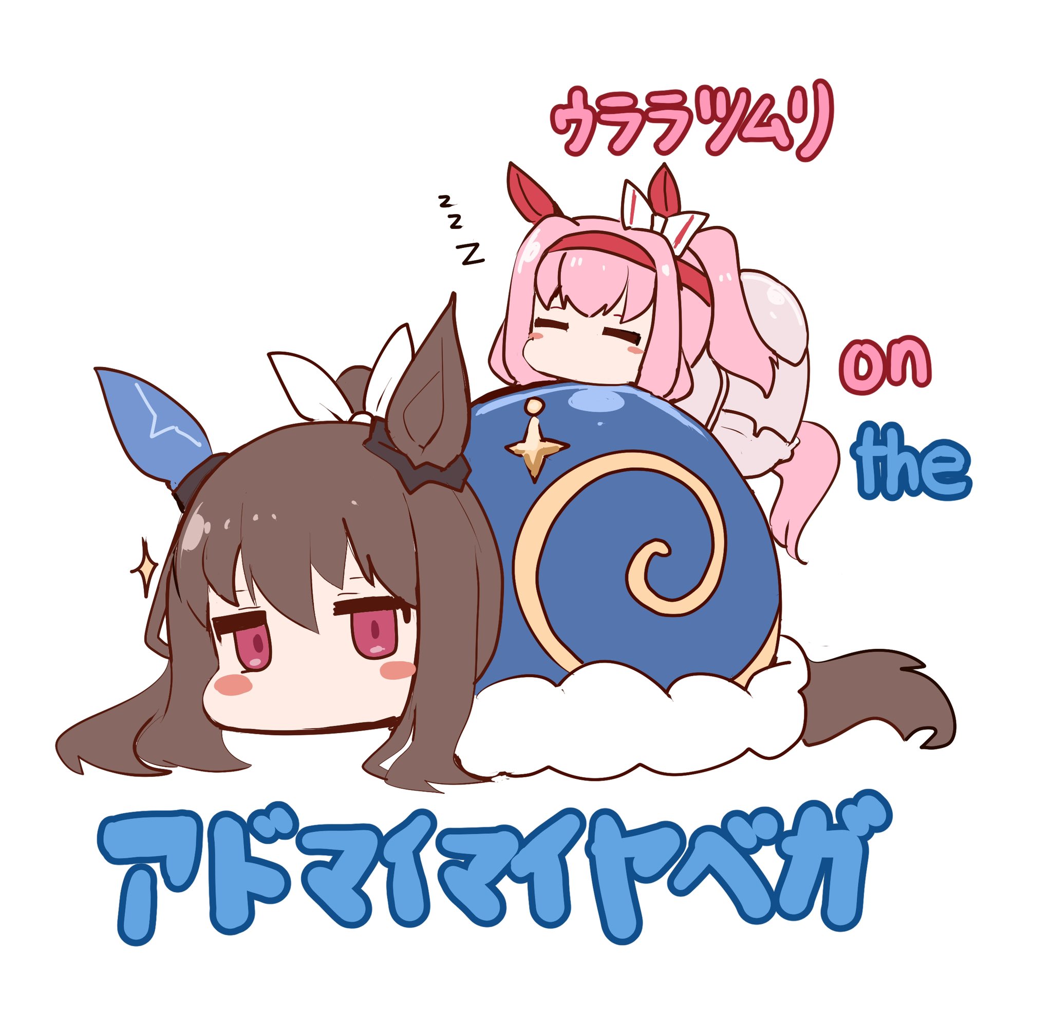 2girls admire_vega_(umamusume) animal_ears bow brown_hair closed_eyes commentary_request ear_bow hair_between_eyes hair_ribbon haru_urara_(umamusume) highres horse_ears horse_girl horse_tail long_hair multiple_girls pink_hair ponytail purple_eyes ribbon shi_(kamokamo910) simple_background tail translation_request umamusume white_background white_bow white_ribbon zzz