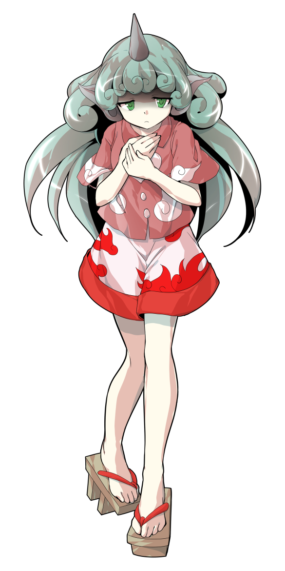 1girl alphes_(style) closed_mouth collared_shirt commentary_request dairi full_body green_eyes green_hair half-closed_eyes horns kariyushi_shirt komainu_girl komano_aunn large_variant_set long_hair looking_at_viewer parody red_shirt shaded_face shirt short_sleeves shorts single_horn solo standing style_parody tachi-e toes touhou transparent_background variant_set white_shorts