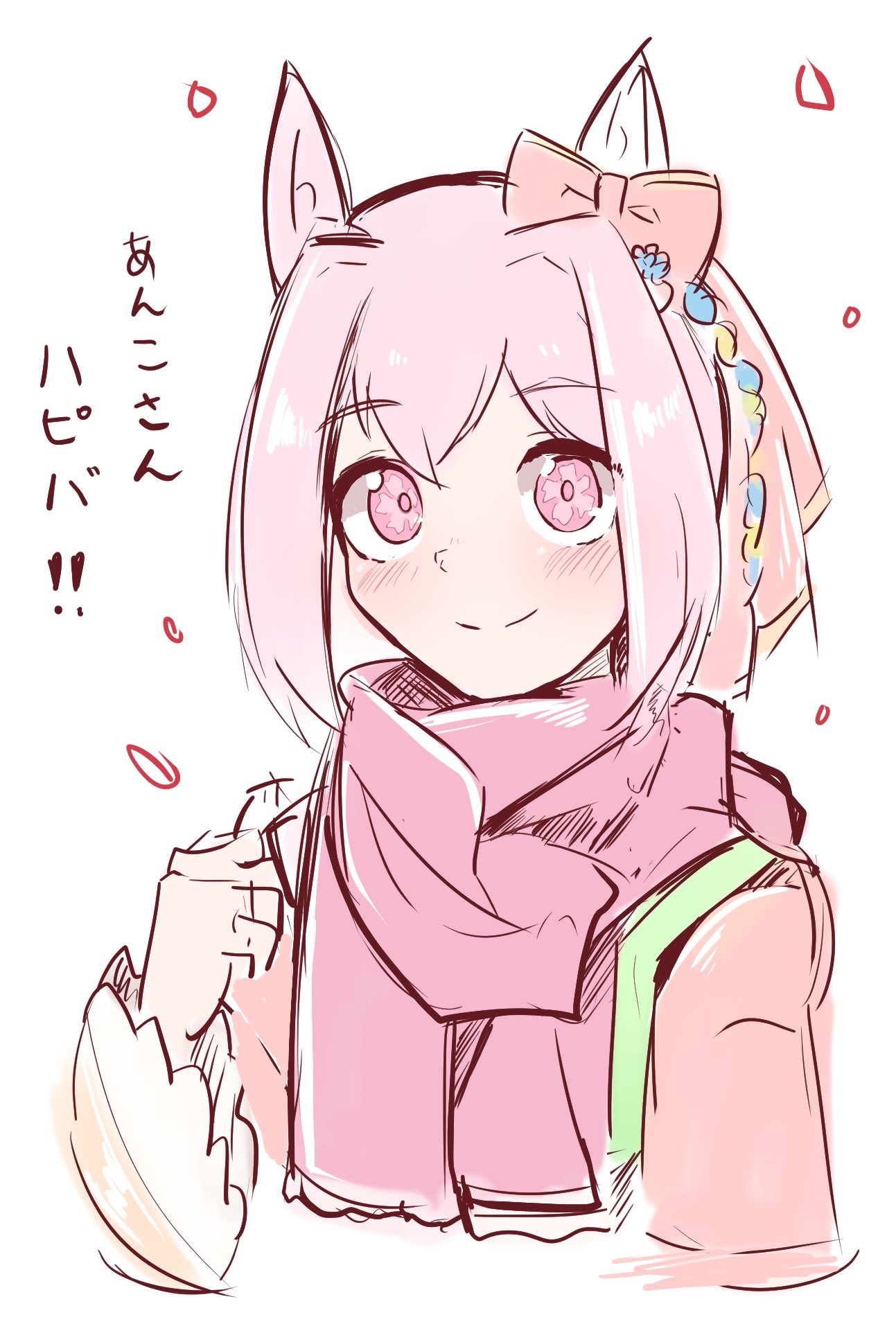 1girl animal_ears blush bow closed_mouth commentary_request cropped_torso ear_bow flower-shaped_pupils hand_up haru_urara_(new_year_new_urara!)_(umamusume) haru_urara_(umamusume) highres horse_ears japanese_clothes kimono long_sleeves looking_at_viewer pink_eyes pink_hair pink_scarf red_bow red_kimono scarf shi_(kamokamo910) simple_background smile solo symbol-shaped_pupils translation_request umamusume upper_body white_background wide_sleeves
