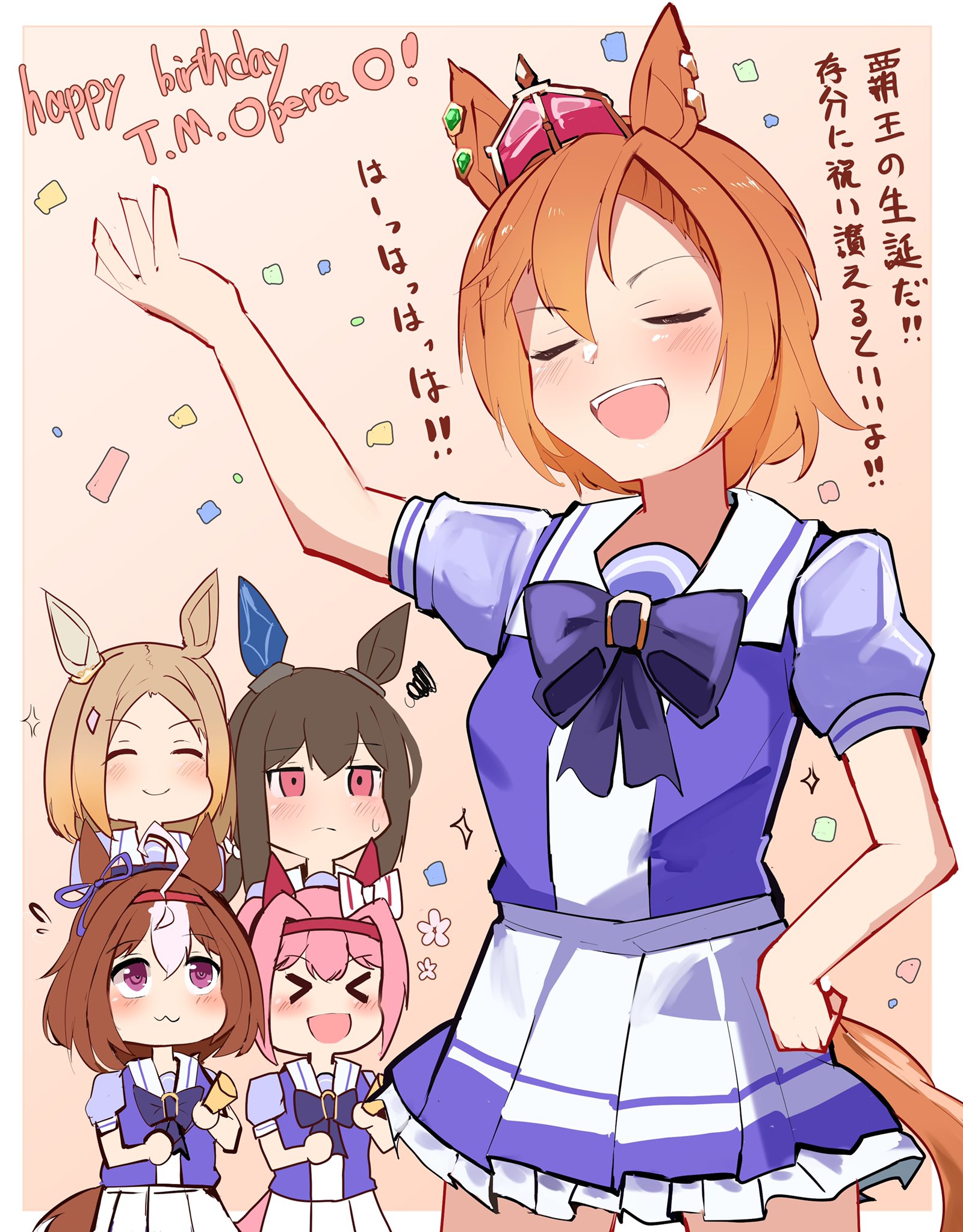>_< 5girls :3 :d @_@ admire_vega_(umamusume) animal_ears arm_up blush bow brown_background brown_hair character_name closed_eyes closed_mouth commentary_request crown ear_bow forehead frilled_skirt frills hair_between_eyes hairband hand_on_own_hip happy_birthday haru_urara_(umamusume) highres holding horse_ears horse_girl horse_tail meisho_doto_(umamusume) mini_crown multiple_girls narita_top_road_(umamusume) open_mouth parted_bangs party_popper pleated_skirt ponytail puffy_short_sleeves puffy_sleeves purple_bow purple_eyes purple_shirt red_hairband shi_(kamokamo910) shirt short_sleeves simple_background skirt smile squiggle t.m._opera_o_(umamusume) tail translation_request umamusume white_bow white_skirt xd