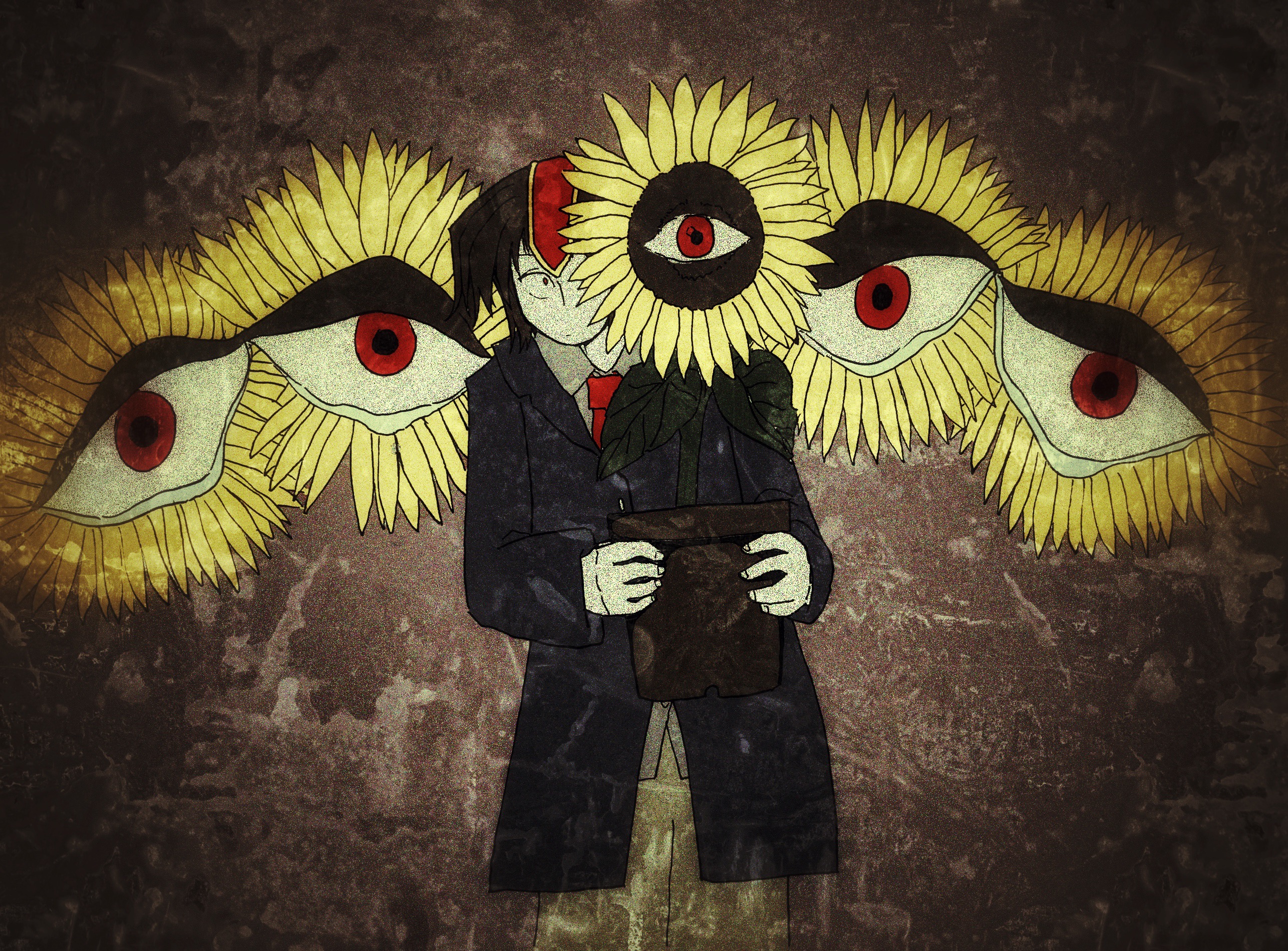 1other androgynous blue_coat brown_background brown_hair brown_pants business_suit closed_mouth coat collared_coat collared_shirt cowboy_shot eye_of_senri fingernails flower flower_pot formal_clothes grey_shirt he_niao_(xinjinjumin810926596951) headgear highres holding holding_flower_pot kokutenshi_hibaru lapels layered_sleeves len'en long_sleeves necktie one_eye_covered other_focus pale_skin pants plant potted_plant red_eyes red_necktie shirt solo spread_wings standing suit sunflower surprised tears traditional_media vignetting wide-eyed yellow_flower