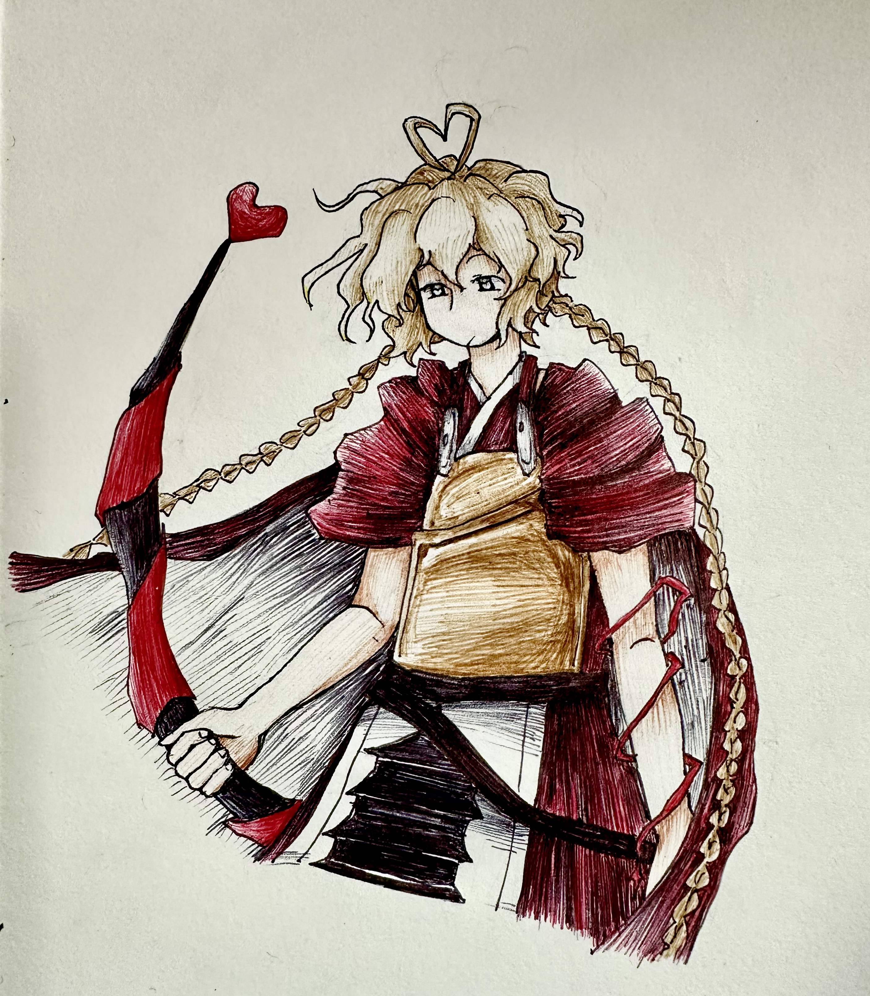 1other absurdres androgynous antenna_hair apron arm_ribbon armor belt black_belt blonde_hair bow_(weapon) braid breastplate cape closed_mouth cropped_legs crossed_belts expressionless frown hakama hakama_skirt he_niao_(xinjinjumin810926596951) heart heart_antenna_hair highres holding holding_bow_(weapon) holding_weapon japanese_clothes kimono len'en long_hair looking_ahead low_twin_braids messy_hair ooama_no_ake_no_mitori other_focus pagoda photo_(medium) red_cape red_hakama red_kimono red_ribbon ribbon skirt sleeveless sleeveless_kimono solo traditional_media twin_braids two-sided_cape two-sided_fabric very_long_hair waist_apron weapon white_apron white_cape yellow_eyes