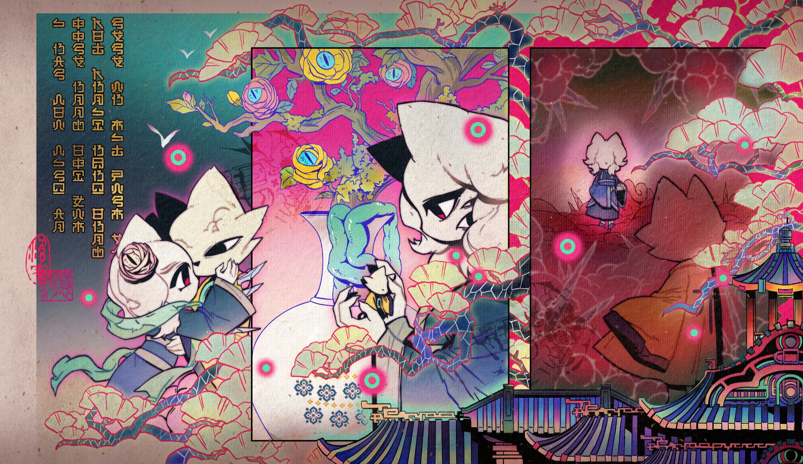 1boy 1girl aqua_eyes architecture black_eyes blue_hanfu border brown_border building character_request chinese_clothes chinese_text commentary commission disembodied_eye east_asian_architecture english_commentary extra_eyes flower from_behind furry furry_female furry_male gears gradient_background hagoromo hair_flower hair_ornament hand_on_another's_cheek hand_on_another's_face hanfu hetero highres hug long_sleeves medium_hair multiple_boys nine_sols no_mouth pink_flower red_eyes shawl sleeves_past_wrists translation_request unclehansuncle vase white_hair wide_sleeves yellow_hanfu