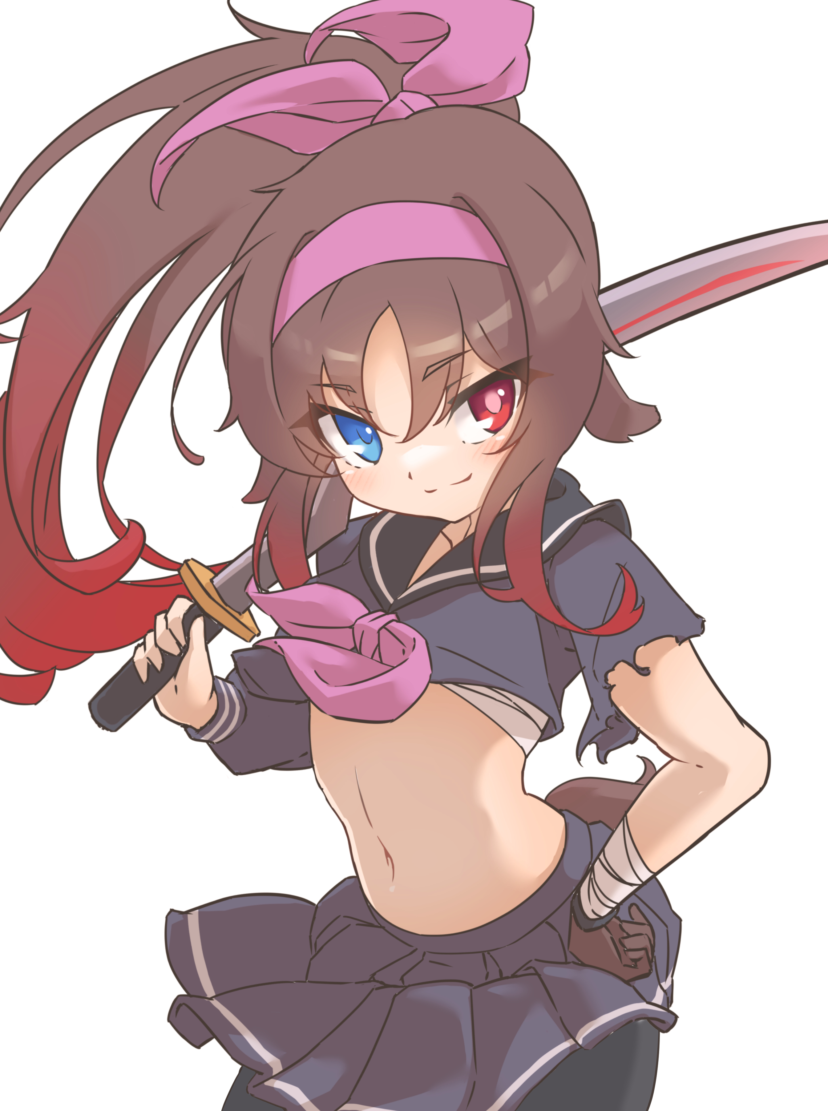 absurdres animal_ears bandana bike_shorts blue_eyes blue_skirt bow brown_hair dog_ears dog_girl dog_tail emil_chronicle_online gradient_hair heterochromia highres holding holding_sword holding_weapon katana multicolored_hair navel ponytail purple_bandana purple_bow purple_ribbon red_eyes red_hair ribbon sarashi school_uniform serafuku shugoma_uzuki silver-index skirt sword tail torn_clothes torn_sleeves weapon white_background