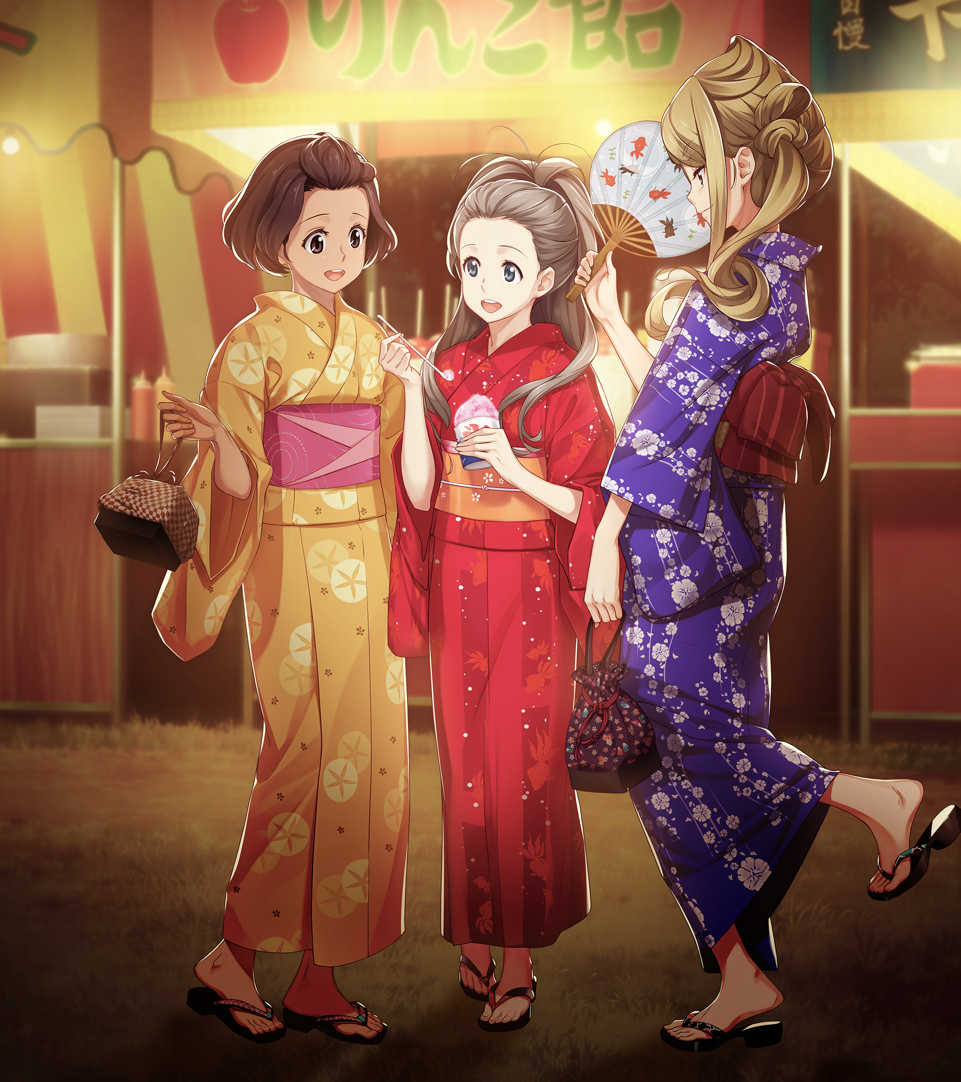 3girls :d black_hair blonde_hair blue_eyes blue_kimono brown_eyes brown_hair cup daitoku_junna floral_print flower food fukuda_tomonori full_body game_cg grey_hair hair_ornament hand_fan happy highres holding japanese_clothes kimono koujiro_frau long_hair long_sleeves looking_at_another multiple_girls non-web_source obi official_alternate_costume official_alternate_hairstyle official_art open_mouth orange_sash pink_kimono pink_sash print_kimono red_kimono robotics;notes robotics;notes_dash sandals sash science_adventure short_hair smile standing standing_on_one_leg summer_festival teeth toenails toes tongue upper_teeth_only yellow_kimono yukata yukifune_airi