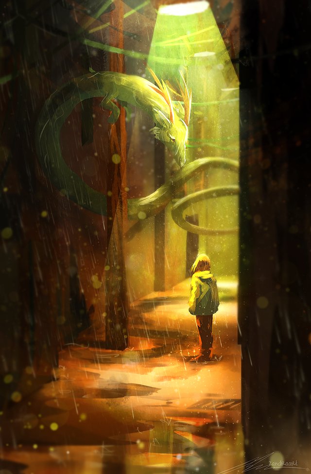 1other animal antlers brown_hair coat dragon eastern_dragon green_coat head_down hood hood_down horns lamppost lens_flare looking_at_another night original outdoors painterly puddle rain reflection reflective_liquid scenery short_hair standing yellow_eyes zandra
