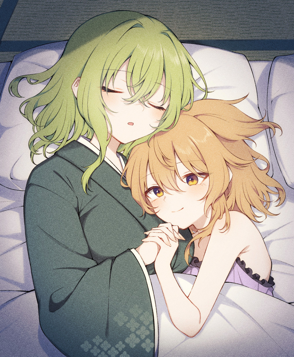2girls alternate_costume bare_shoulders blanket blonde_hair breasts closed_eyes closed_mouth commentary_request crossed_bangs floor floral_print frills futon green_hair green_kimono hair_between_eyes highres holding_hands indoors japanese_clothes kimono long_sleeves looking_at_another lying medium_breasts multiple_girls on_bed on_side open_mouth pillow pointy_hair purple_tank_top short_hair sleeping smile soga_no_tojiko tama_(soon32281) tank_top touhou toyosatomimi_no_miko wide_sleeves yellow_eyes yuri