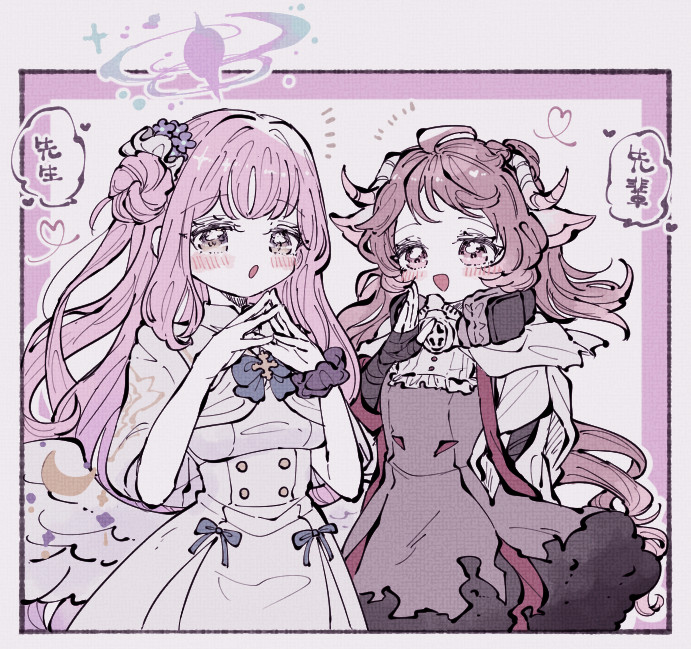 2girls animal_ears arknights blue_archive breasts brown_dress brown_eyes brown_hair capelet commentary_request cowboy_shot dress eyjafjalla_(arknights) goat_ears goat_horns hair_bun halo hands_up horns looking_at_viewer medium_breasts mika_(blue_archive) mocamon multiple_girls open_mouth scrunchie single_side_bun smile translated white_capelet white_dress wrist_scrunchie