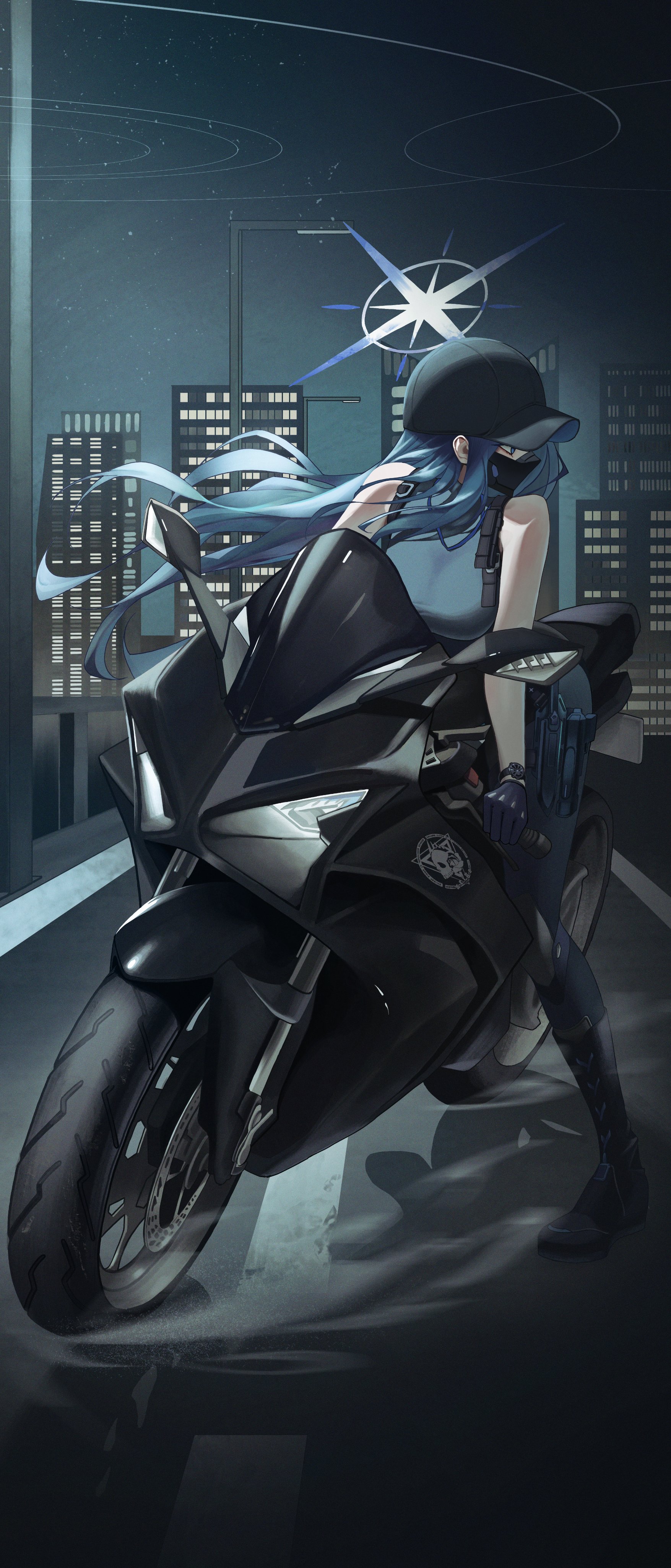 4meart0112 absurdres baseball_cap blue_archive blue_hair blue_halo boots buckle chest_harness cityscape colored_inner_hair full_body halo harness hat highres long_hair looking_to_the_side motor_vehicle motorcycle multicolored_hair night no_mask saori_(blue_archive) snap-fit_buckle tank_top thigh_sheath