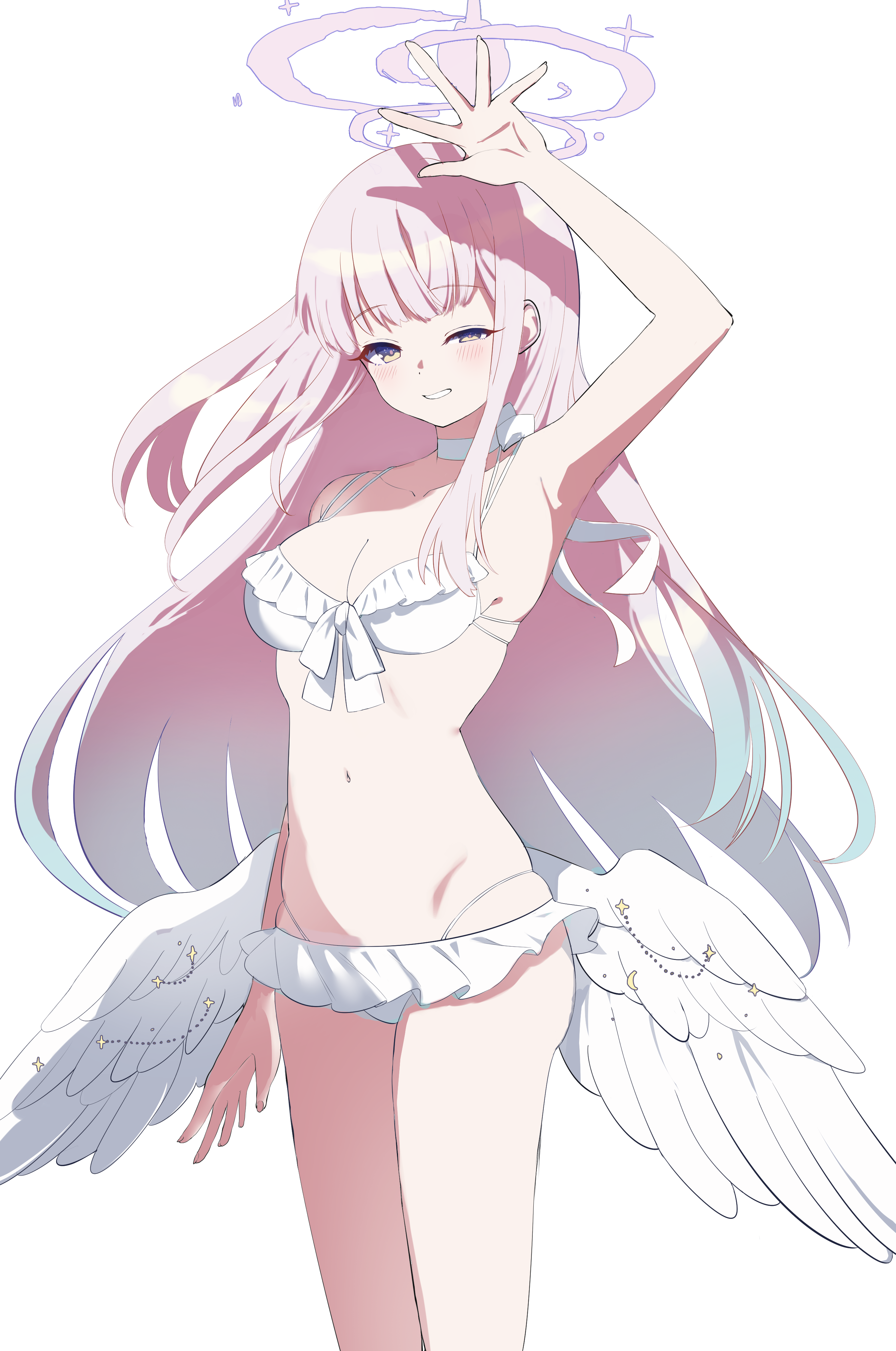 1girl absurdres angel_wings bikini blue_archive blue_hair blush breasts choker crescent_ornament feathered_wings frilled_bikini frills gradient_hair halo hand_up highres long_hair looking_at_viewer low_wings mika_(blue_archive) mika_(swimsuit)_(blue_archive) multicolored_hair omeme_mememe pink_hair pink_halo smile solo star_ornament swimsuit white_bikini white_choker white_wings wing_ornament wings yellow_eyes