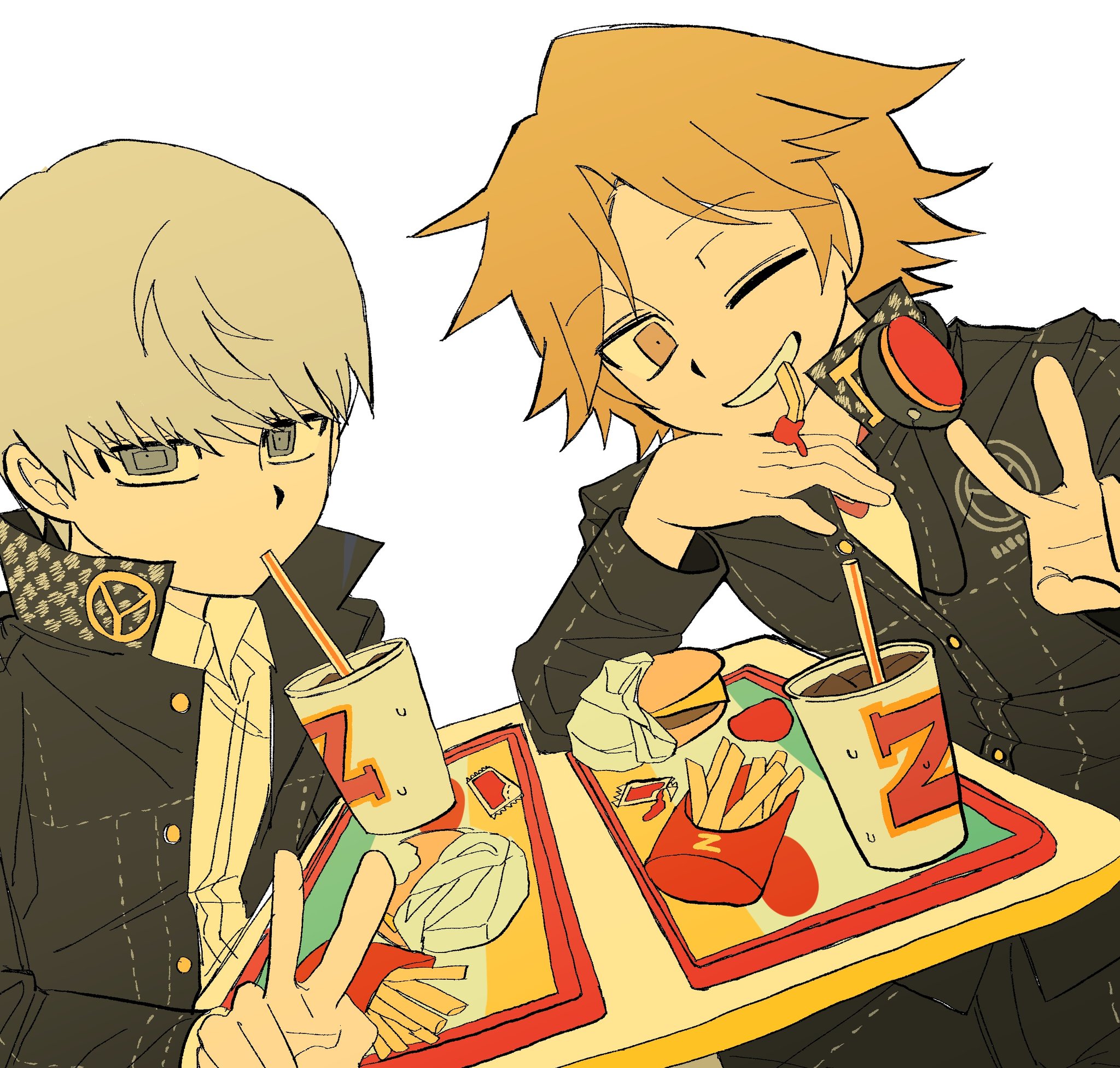 2boys black_jacket black_pants brown_eyes brown_hair burger commentary_request cup disposable_cup drinking_straw food french_fries gakuran grey_eyes grey_hair hanamura_yousuke headphones headphones_around_neck highres jacket jjan_ne korean_commentary looking_at_viewer male_focus multiple_boys narukami_yu one_eye_closed pants persona persona_4 school_uniform shirt short_hair simple_background sitting smile soda table v white_background white_shirt yasogami_school_uniform